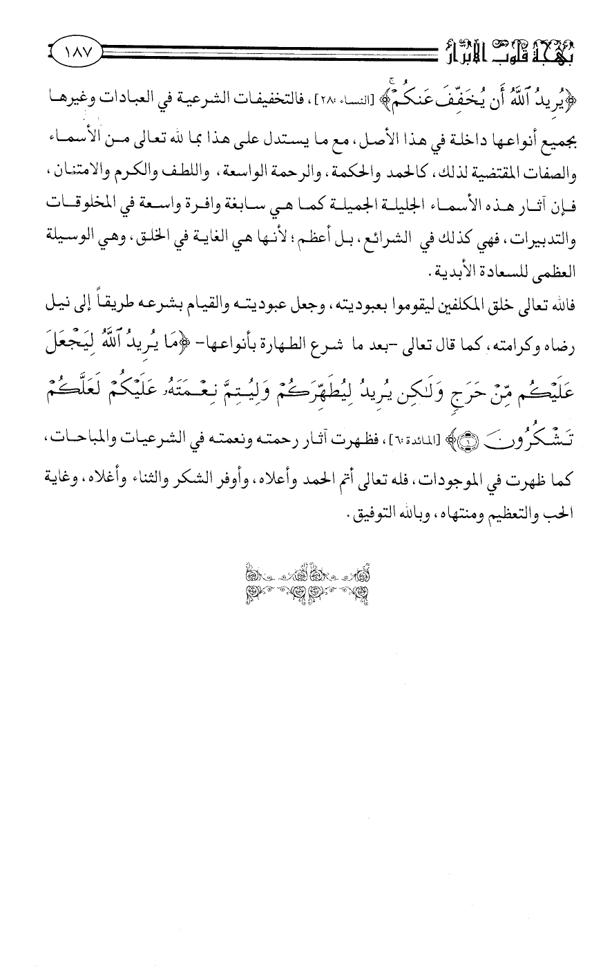 فالله تعالى خلق المكلفين ليقوموا بعبوديته. وجعل عبوديته والقيام بشرعه طريقاً إلى نيل رضاه وكرامته. كما قال تعالى -بعد ما شرع الطهارة بأنواعها- {مَا يُرِيدُ اللهُ لِيَجْعَلَ عَلَيْكُم مِّنْ حَرَجٍ وَلَكِن يُرِيدُ لِيُطَهَّرَكُمْ وَلِيُتِمَّ نِعْمَتَهُ عَلَيْكُمْ لَعَلَّكُمْ تَشْكُرُونَ} [المائدة:6] . فظهرت آثار رحمته ونعمته في الشرعيات والمباحات، كما ظهرت في الموجودات. فله تعالى أتمّ الحمد وأعلاه، وأوفر الشكر والثناء وأغلاه، وغاية الحب والتعظيم ومنتهاه. وبالله التوفيق.