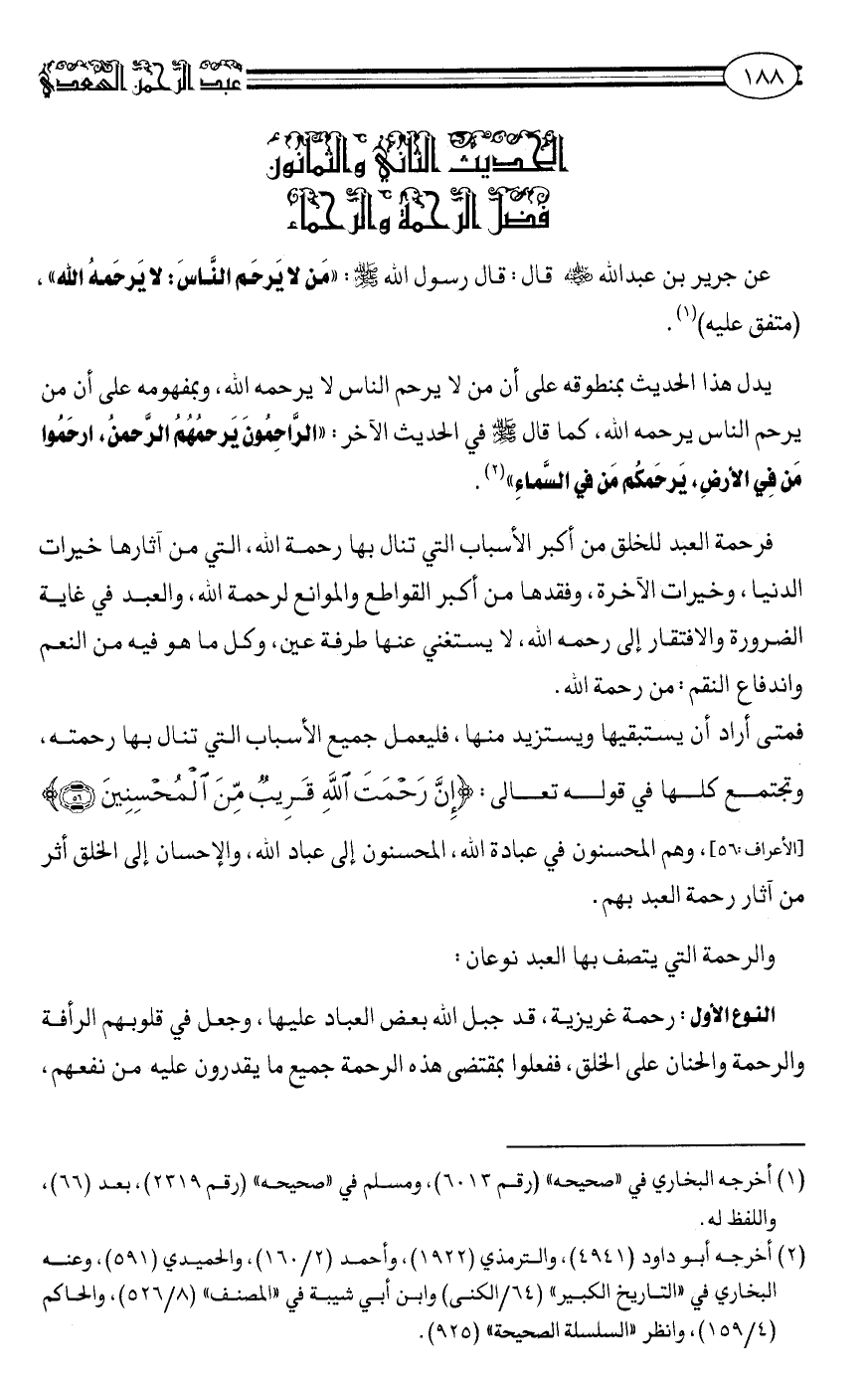 عَنْ جَرِيرِ بْنِ عَبْدِ اللَّهِ رضي الله عنه قَالَ: قَالَ رَسُولُ اللَّهِ صلى الله عليه وسلم: "مَنْ لَا يَرْحَمِ النَّاسَ: لَا يرحمه الله" متفق عليه1.