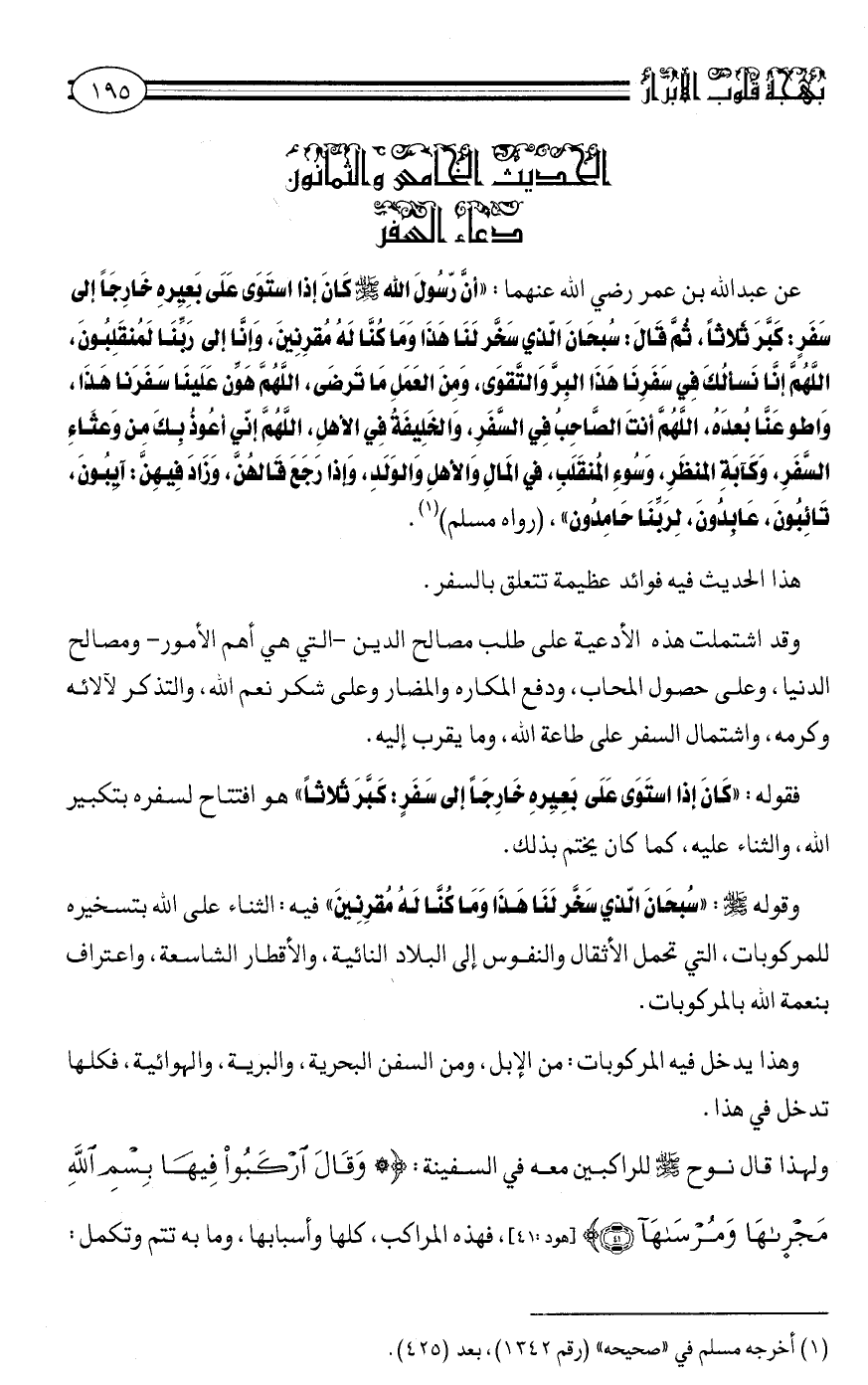 عَنْ عَبْدِ اللَّهِ بْنِ عُمَرَ رَضِيَ اللَّهُ عَنْهُمَا: "أن رسول الله صلى الله عليه وسلم كَانَ إِذَا اسْتَوَى عَلَى بَعِيرِهِ خَارِجًا إِلَى سَفَرٍ: كَبَّرَ ثَلَاثًا، ثُمَّ قَالَ: سُبْحَانَ الَّذِي سَخَّرَ لَنَا هَذَا وَمَا كُنَّا لَهُ مُقْرنين، وَإِنَّا إِلَى رَبِّنَا لَمُنْقَلِبُونَ. اللَّهمَّ إِنَّا نَسْأَلُكَ فِي سَفَرِنَا هَذَا البِرَّ وَالتَّقْوَى، وَمِنَ الْعَمَلِ مَا تَرْضَى. اللَّهمَّ هَوِّن عَلَيْنَا سَفَرَنَا هَذَا، واطوِ عَنَّا بُعده. اللَّهمَّ أَنْتَ الصَّاحِبُ فِي السَّفَرِ، وَالْخَلِيفَةُ فِي الْأَهْلِ. اللَّهمَّ إِنِّي أَعُوذُ بِكَ مِنْ وَعْثاء السَّفَرِ، وَكَآبَةِ الْمَنْظَرِ، وَسُوءِ الْمُنْقَلَبِ، فِي الْمَالِ وَالْأَهْلِ وَالْوَلَدِ. وَإِذَا رَجَعَ قَالَهُنَّ، وَزَادَ فِيهِنَّ: آيِبُونَ، تَائِبُونَ، عَابِدُونَ، لِرَبِّنَا حامدون" رواه مسلم1.