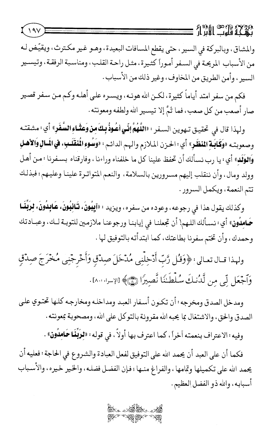 ولهذا قال في تحقيق تهوين السفر: "اللَّهمَّ إِنِّي أَعُوذُ بِكَ مِنْ وَعْثَاءِ السَّفَرِ" أي: مشقته وصعوبته "وكآبة المنظر" أي: الحزن الملازم والهم الدائم "وسوء المنقلب، في المال والأهل الوالد" أي: يا رب نسألك أن تحفظ علينا كل ما خلّفناه وراءنا، وفارقناه بسفرنا من أهل وولد ومال، وأن ننقلب إليهم مسرورين بالسلامة، والنعم المتواترة علينا وعليهم؛ فبذلك تتم النعمة، ويكمل السرور.