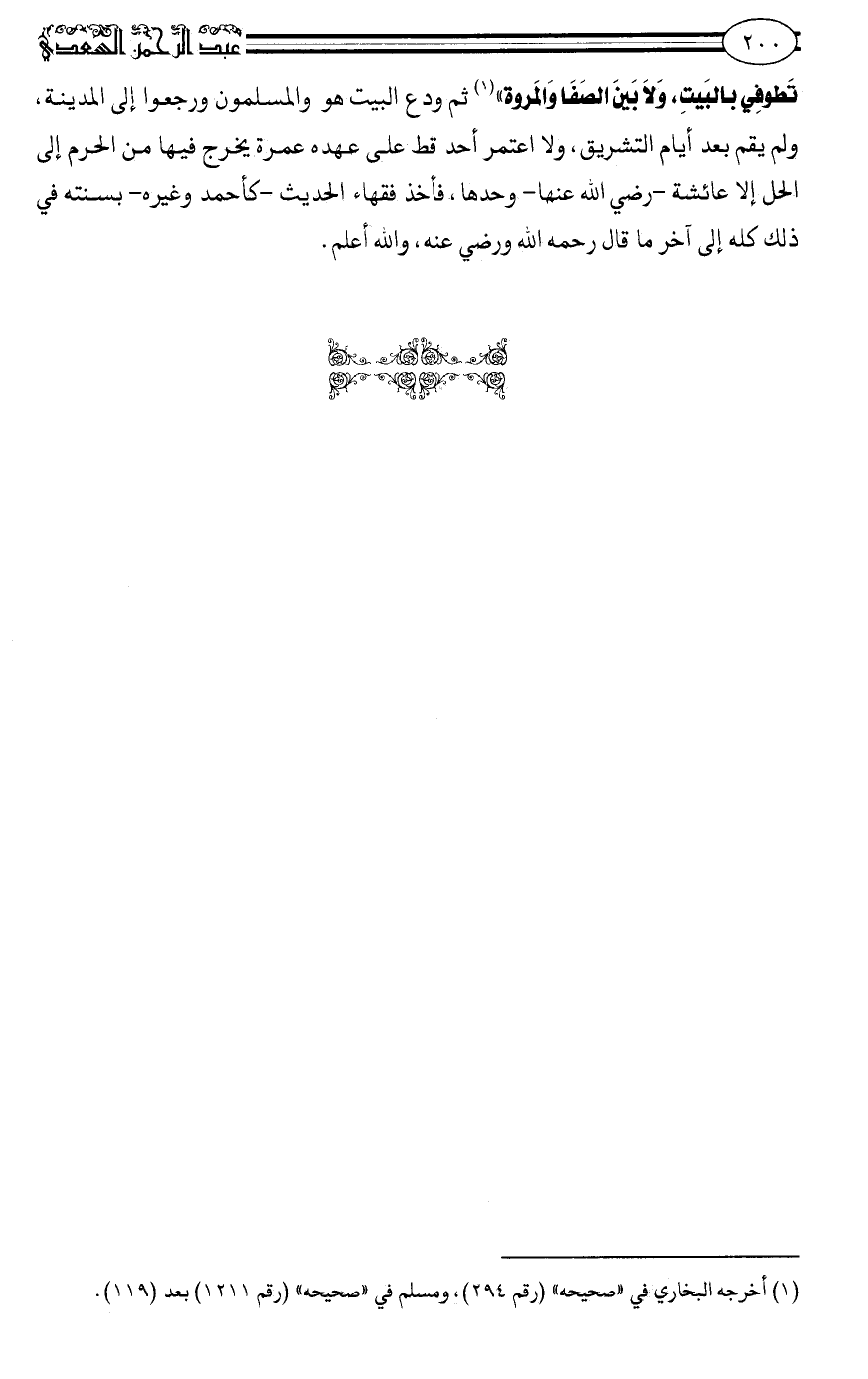 تطوفي بالبيت، ولا بين الصفا والمروة"1 ثم ودع البيت هو والمسلمون ورجعوا إلى المدينة. ولم يقم بعد أيام التشريق، ولا اعتمر أحد قط على عهده عمرة يخرج فيها من الحرم إلى الحل إلا عائشة -رضي الله عنها- وحدها فأخذ فقهاء الحديث -كأحمد وغيره- بسنته في ذلك كله، إلى آخر ما قال رحمه الله ورضي عنه. والله أعلم.