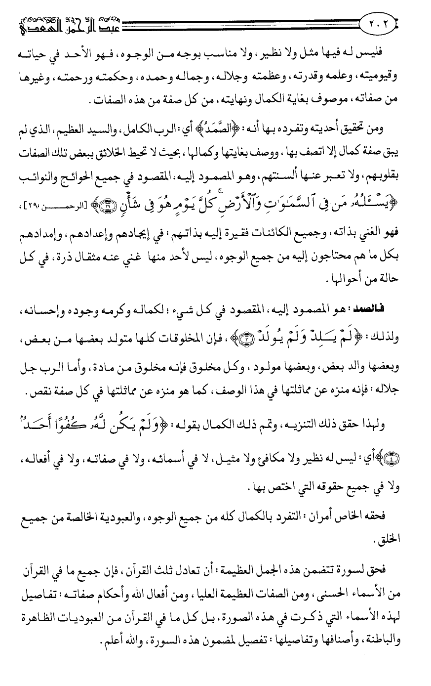 فالصمد: هو المصمود إليه، المقصود في كل شيء؛ لكماله وكرمه وجوده وإحسانه. ولذلك {لم يلد ولم يولد} فإن المخلوقات كلها متولد بعضها من بعض، وبعضها والد بعض، وبعضها مولود وكل مخلوق فإنه مخلوق من مادة، وأما الرب جل جلاله، فإنه منزه عن مماثلتها في هذا الوصف، كما هو منزه عن مماثلتها في كل صفة نقص.