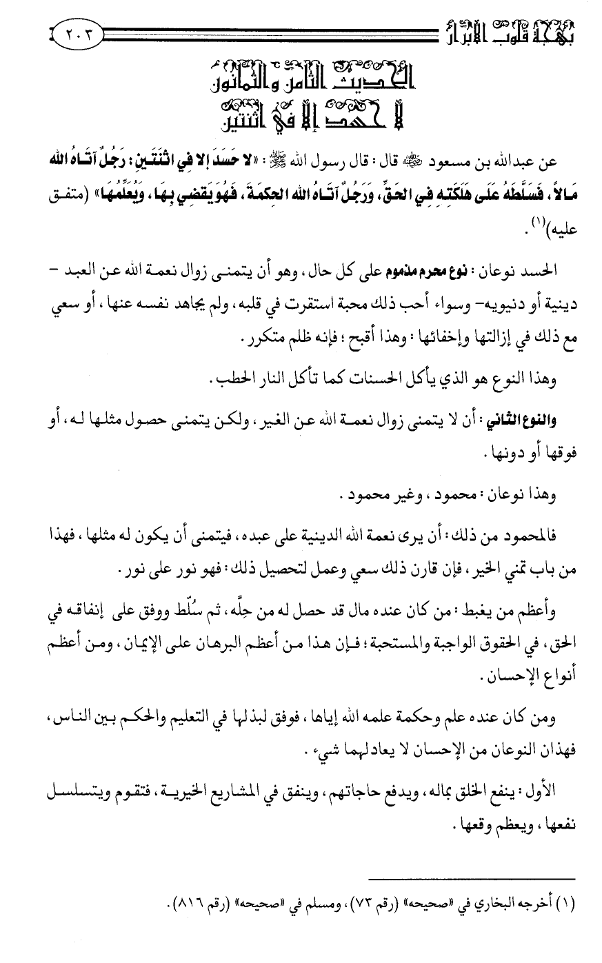 عَنْ عَبْدِ اللَّهِ بْنِ مَسْعُودٍ رضي الله عنه قَالَ: قَالَ رَسُولُ اللَّهِ صلى الله عليه وسلم: "لَا حَسَدَ إِلَّا فِي اثْنَتَيْنِ: رَجُلٌ آتَاهُ اللَّهُ مَالًا، فَسَلَّطَهُ عَلَى هَلَكَتِهِ فِي الْحَقِّ. وَرَجُلٌ آتَاهُ اللَّهُ الْحِكْمَةَ، فَهُوَ يقضي بها، ويعلّمها" متفق عليه1.