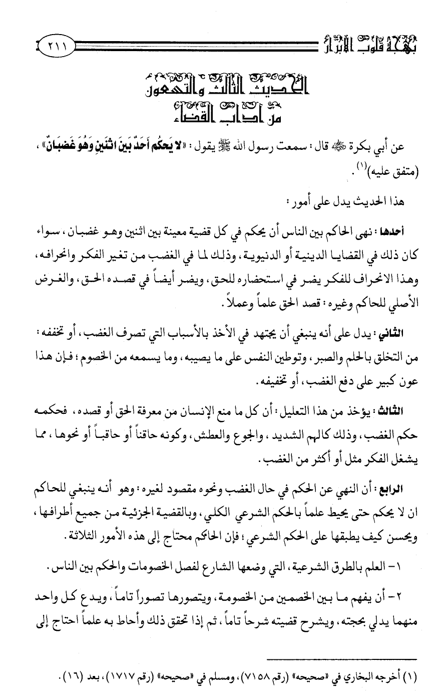 عن أبي بكرة رضي الله عنه قَالَ: سَمِعْتُ رَسُولَ اللَّهِ صلى الله عليه وسلم يَقُولُ: "لَا يَحْكُمْ أَحَدٌ بَيْنَ اثْنَيْنِ وَهُوَ غَضْبَانُ" مُتَّفَقٌ عَلَيْهِ1.