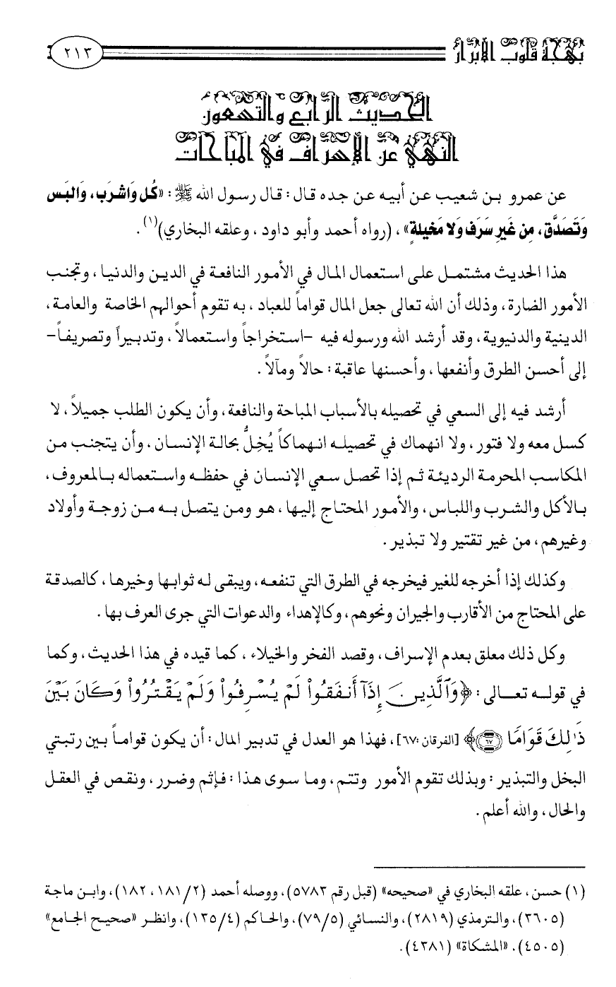 عَنْ عَمْرِو بْنِ شُعَيْبٍ عَنْ أَبِيهِ عَنْ جَدِّهِ قَالَ: قَالَ رَسُولُ اللَّهِ صلى الله عليه وسلم: "كُلْ واشرب، والبَسْ وتصدق، من غَيْرِ سَرَف وَلَا مَخيلة" رَوَاهُ أَحْمَدُ وَأَبُو داود. وعلقه البخاري1.