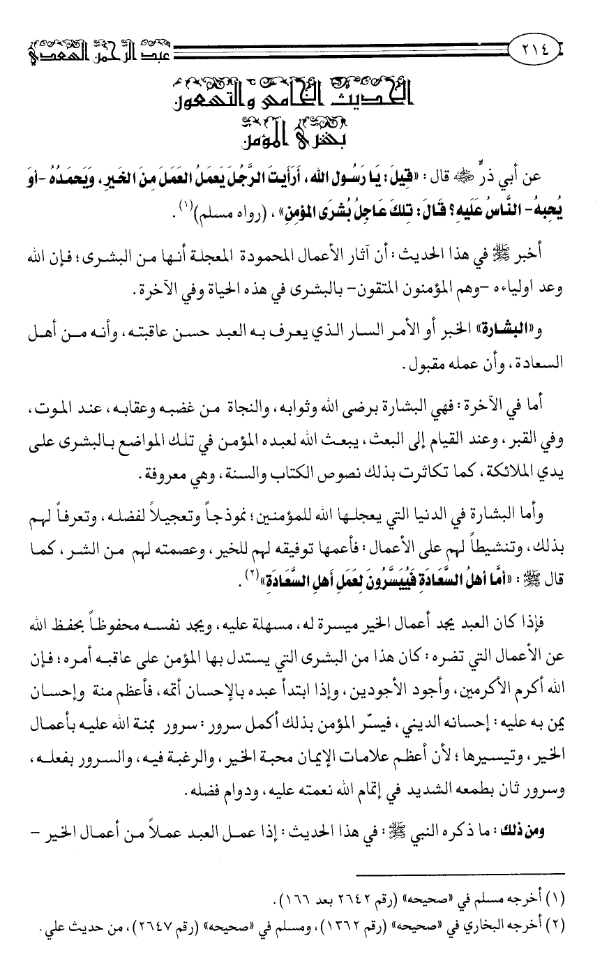 عَنْ أَبِي ذرٍّ رضي الله عنه قَالَ: "قِيلَ: يَا رَسُولَ اللَّهِ، أَرَأَيْتَ الرَّجُلَ يَعْمَلُ الْعَمَلَ مِنَ الْخَيْرِ، وَيَحْمَدُهُ -أَوْ يُحِبُّهُ- النَّاسُ عَلَيْهِ؟ قَالَ: تلك عاجل بشرى المؤمن" رواه مسلم1.