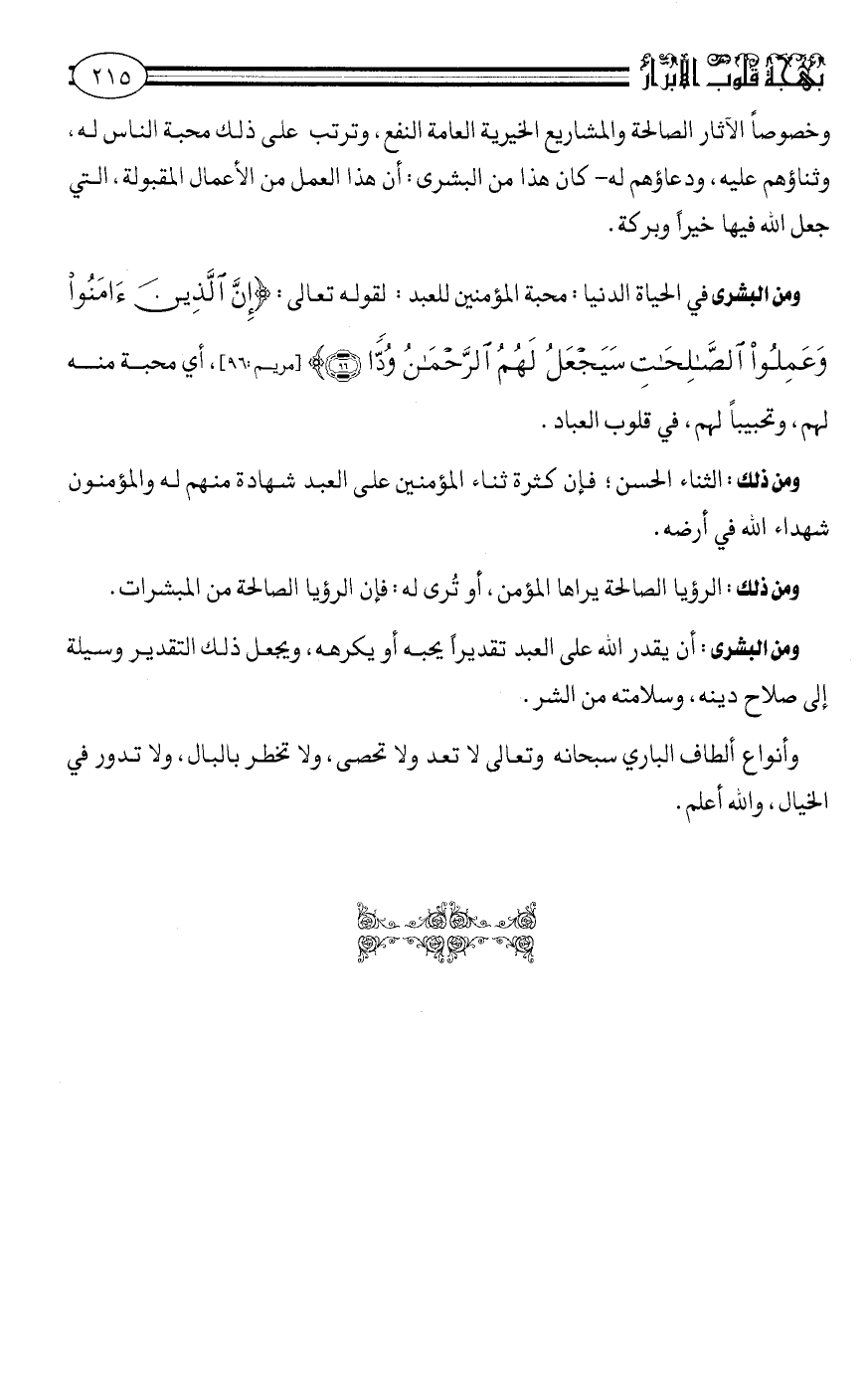 ومن البشرى في الحياة الدنيا، محبة المؤمنين للعبد: لقوله تعالى: {إِنَّ الَّذِينَ آمَنُوا وَعَمِلُوا الصَّالِحَاتِ سَيَجْعَلُ لَهُمُ الرَّحْمَنُ وُدًّا} [مريم:96] أي محبة منه لهم، وتحبيباً لهم في قلوب العباد.