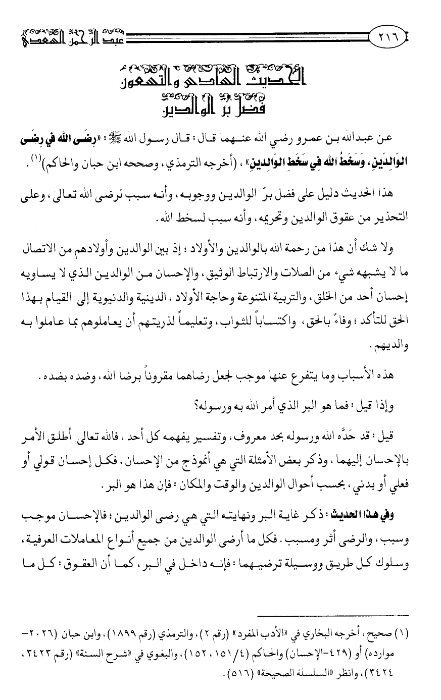 عَنْ عَبْدِ اللَّهِ بْنِ عَمْرٍو رَضِيَ اللَّهُ عَنْهُمَا قَالَ: قَالَ رَسُولُ اللَّهِ صلى الله عليه وسلم: "رِضَى اللَّهِ فِي رِضَى الْوَالِدَيْنِ. وَسَخَطُ اللَّهِ فِي سَخَطِ الْوَالِدَيْنِ" أخرجه الترمذي. وصححه ابن حبان والحاكم1.