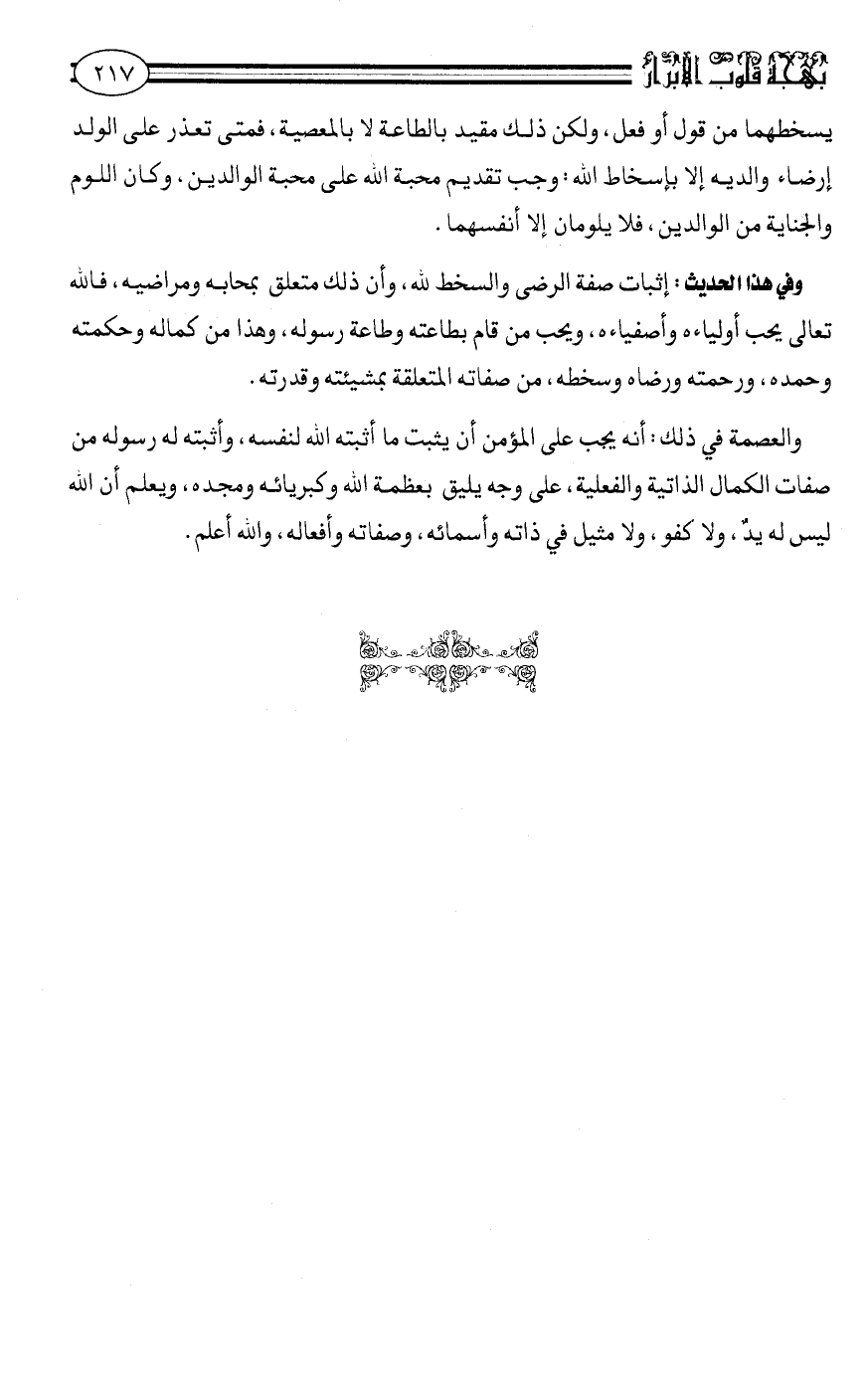 يسخطهما من قول أو فعل. ولكن ذلك مقيد بالطاعة لا بالمعصية. فمتى تعذر على الولد إرضاء والديه إلا بإسخاط الله، وجب تقديم محبة الله على محبة الوالدين. وكان اللوم والجناية من الوالدين، فلا يلومان إلا أنفسهما.