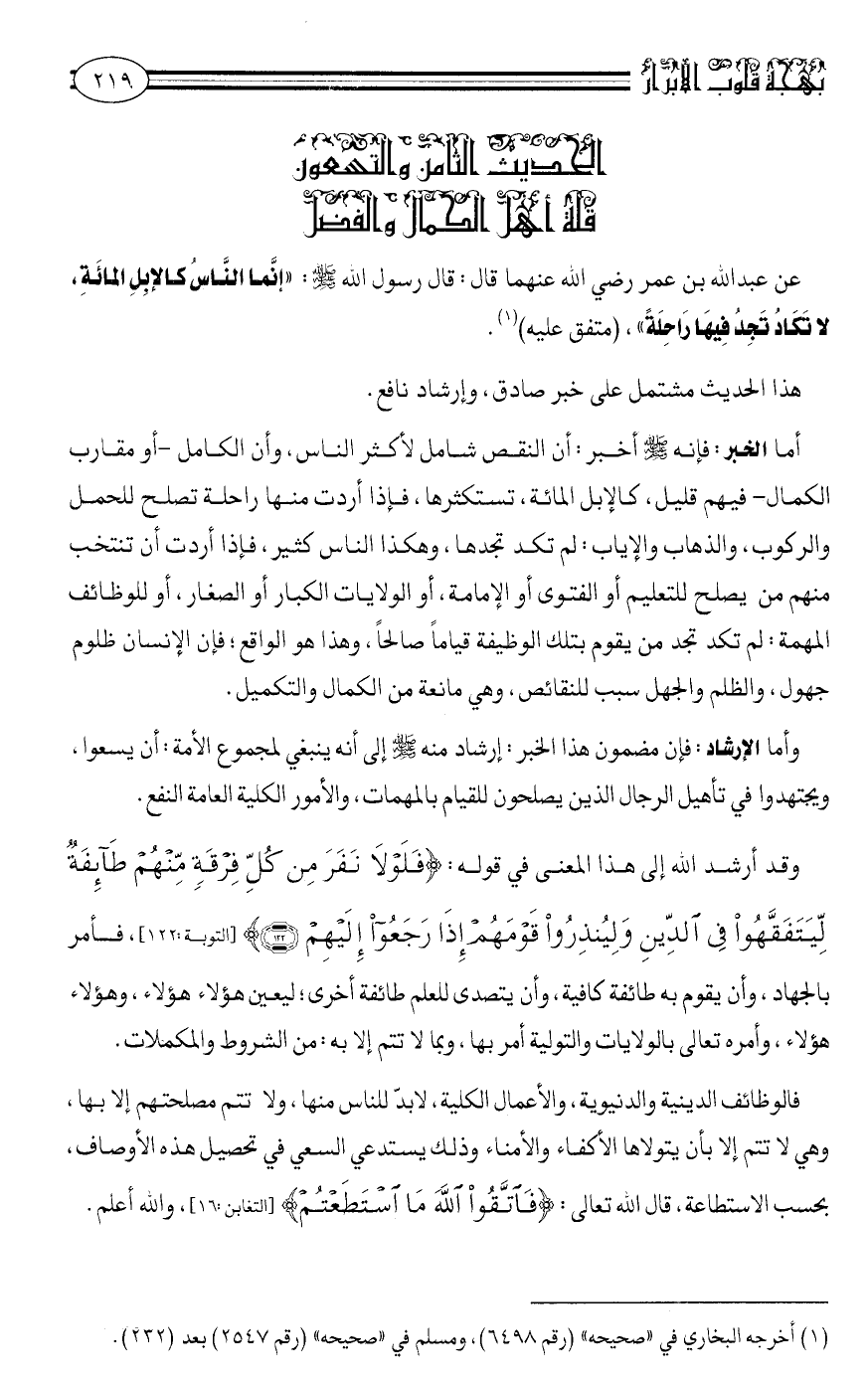 أما الخبر، فإنه صلّى الله عليه وسلم أخبر، أن النقص شامل لأكثر الناس، وأن الكامل -أو مقارب الكمال- فيهم قليل، كالإبل المائة، تستكثرها. فإذا أردت منها راحلة تصلح للحمل والركوب، والذهاب والإياب، لم تكد تجدها. وهكذا الناس كثير. فإذا أردت أن تنتخب منهم من يصلح للتعليم أو الفتوى أو الإمامة، أو الولايات الكبار أو الصغار، أو للوظائف المهمة، لم تكد تجد من يقوم بتلك الوظيفة قياماً صالحاً. وهذا هو الواقع؛ فإن الإنسان ظلوم جهول، والظلم والجهل سبب للنقائص، وهي مانعة من الكمال والتكميل.
