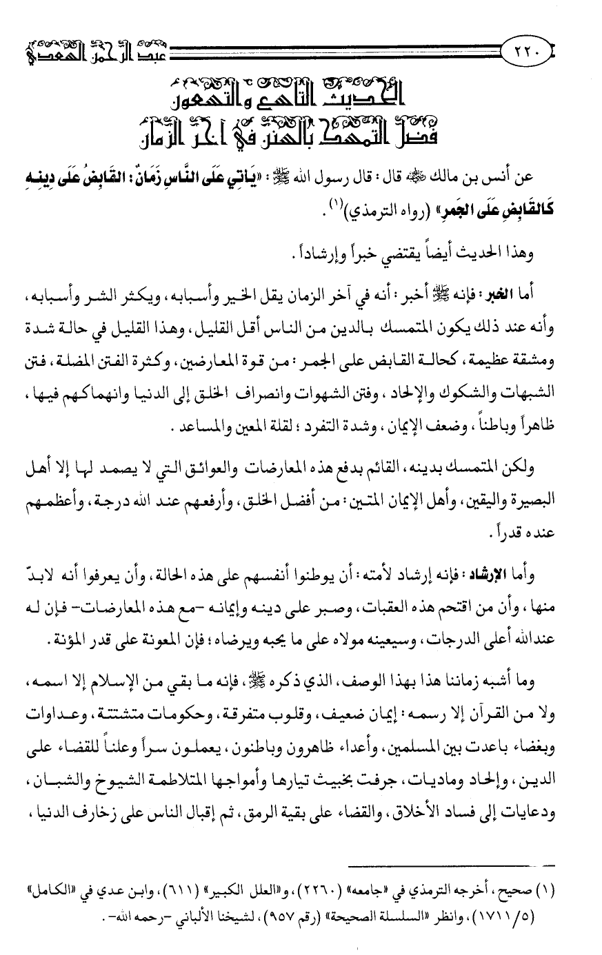عَنْ أَنَسِ بْنِ مَالِكٍ رضي الله عنه قَالَ: قَالَ رَسُولُ اللَّهِ صلى الله عليه وسلم: "يِأْتِي عَلَى النَّاسِ زَمَانٌ الْقَابِضُ عَلَى دِينِهِ كَالْقَابِضِ عَلَى الْجَمْرِ" رَوَاهُ الترمذي1.