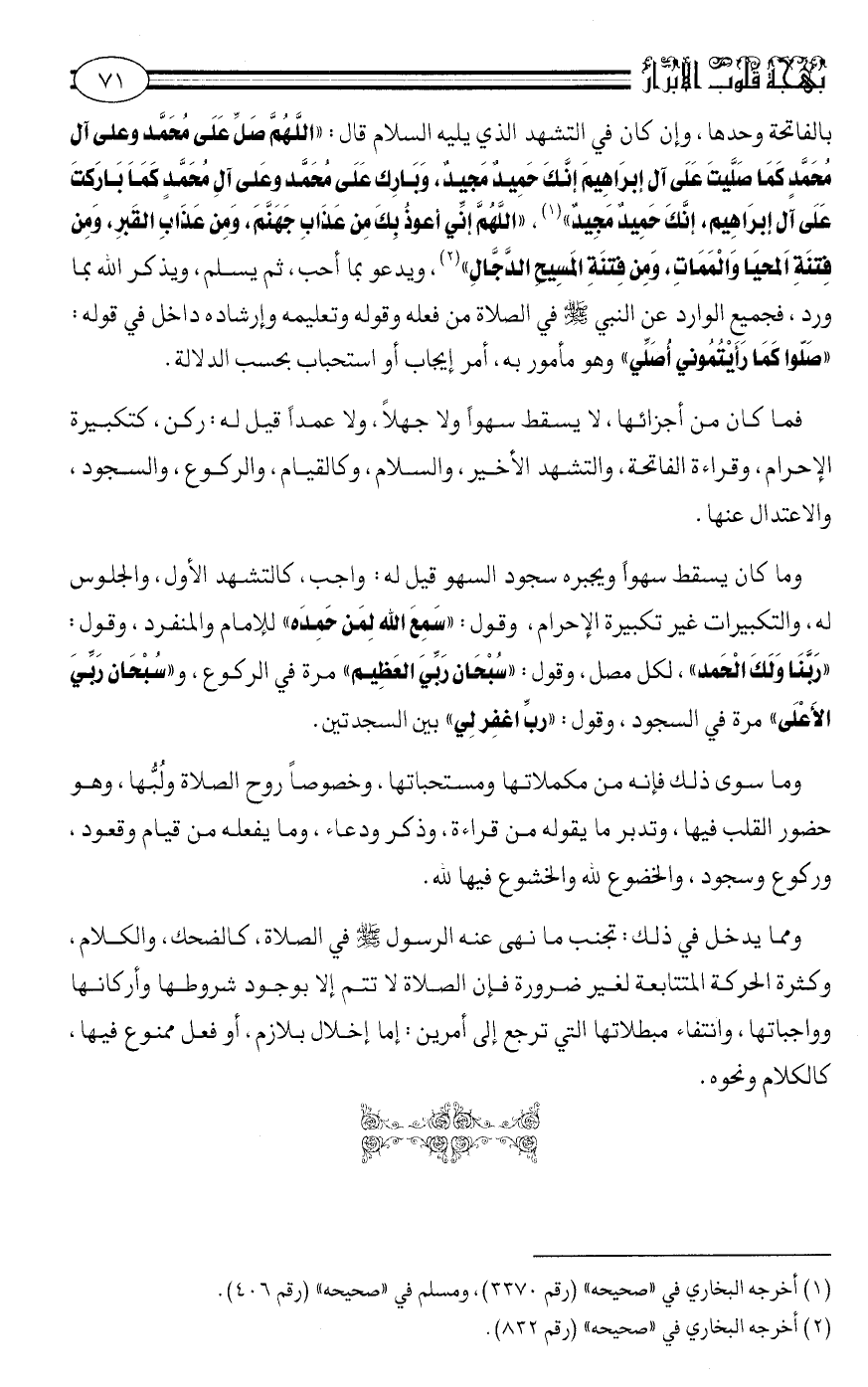 بالفاتحة وحدها، وإن كان في التشهد الذي يليه السلام قال: "اللهم صلّ على محمد وعلى آل محمد كما صليت على آل إبراهيم، إنك حميد مجيد، وبارك على محمد وعلى آل محمد كما باركت على آل إبراهيم، إنك حميد مجيد"1، "اللهم إني أعوذ بك من عذاب جهنم، ومن عذاب القبر، ومن فتنة المحيا والممات، ومن فتنة المسيح الدجال"2 ويدعو بما أحب، ثم يسلمّ، ويذكر الله بما ورد، فجميع الوارد عن النبي صلّى الله عليه وسلم في الصلاة من فعله وقوله وتعليمه وإرشاده داخل في قوله: "صلّوا كما رأيتموني أصلي" وهو مأمور به، أمر إيجاب أو استحباب بحسب الدلالة.