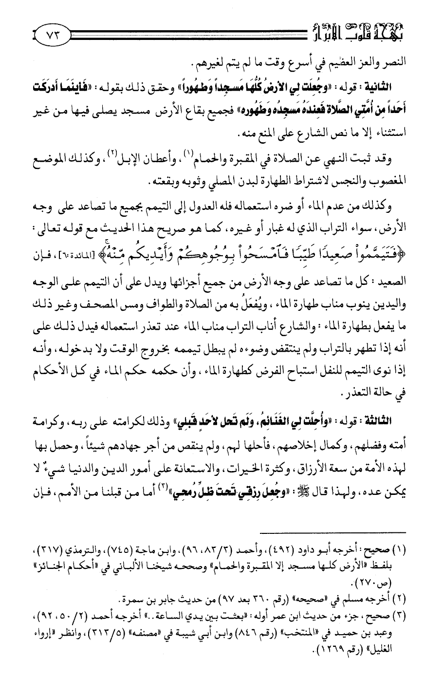 (1) صحيح: أخرجه أبو داود 492, وأحمد 3/83, 96, وابن ماجه 745, والترمذي 317, بلفظ: "الأرض كلّها مسجد إلاّ المقبرة والحمام" وصحّحه شيخنا الألباني في "أحكام الجنائز" ص270.