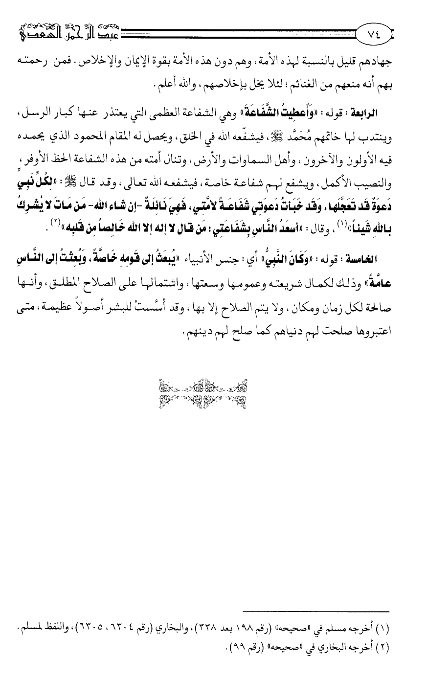 الرابعة: قوله: "وأعطيت الشفاعة" وهي الشفاعة العظمى التي يعتذر عنها كبار الرسل، وينتدب لها خاتمهم محمد صلّى الله عليه وسلم. فيشفّعه الله في الخلق. ويحصل له المقام المحمود الذي يحمده فيه الأولون والآخرون، وأهل السماوات والأرض. وتنال أمته من هذه الشفاعة الحظ الأوفر، والنصيب الأكمل. ويشفع لهم شفاعة خاصة، فيشفعه الله تعالى. وقد قال صلّى الله عليه وسلم: "لكل نبي دعوة تعجَّلَها. وقد خَبَّأتُ دعوتي شفاعة لأمتي، فهي نائلة – إن شاء الله – من مات لا يشرك بالله شيئاً"1، وقال: "أسعد الناس بشفاعتي: من قال لا إله إلا الله خالصاً من قلبه"2.