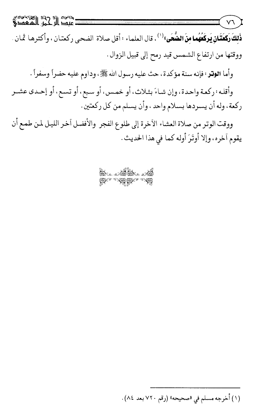 ذلك ركعتان يركعهما من الضحى"1 قال العلماء: أقل صلاة الضحى ركعتان، وأكثرها ثمان، ووقتها من ارتفاع الشمس قِيْدَ رمح إلى قبيل الزوال.