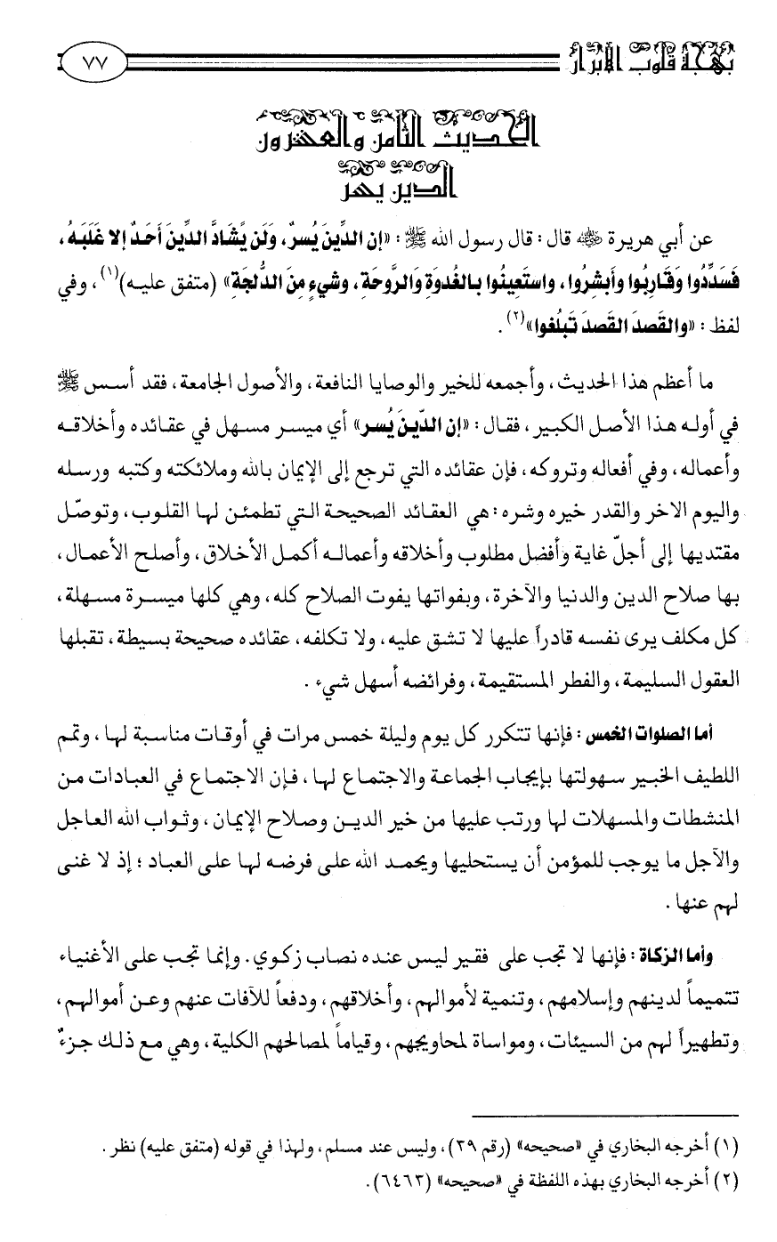 عن أبي هريرة رضي الله عنه قال: قال رسول الله صلى الله عليه وسلم: "إِنَّ الدِّينَ يُسْر، وَلَنْ يَشادَّ الدينَ أَحَدٌ إِلَّا غَلَبَهُ، فسَدِّدوا وَقَارِبُوا وَأَبْشِرُوا، وَاسْتَعِينُوا بالغُدْوة وَالرَّوْحَةِ، وَشَيْءٍ مِنَ الدُّلَجة" مُتَّفَقٌ عَلَيْهِ1. وَفِي لفظ "والقصدَ القصدَ تَبْلُغوا"2.
