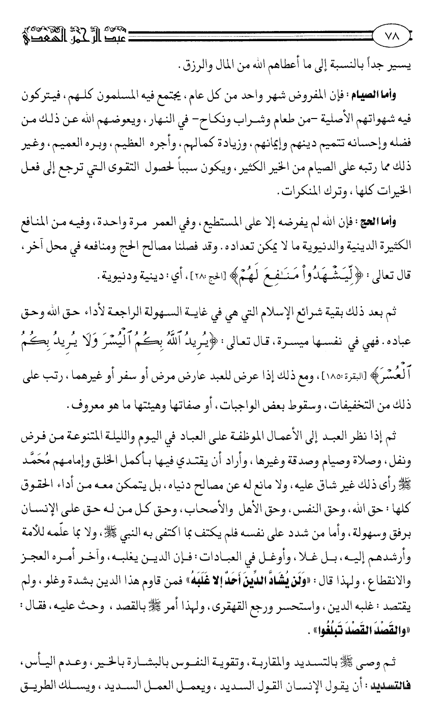 ثم إذا نظر العبد إلى الأعمال الموظفة على العباد في اليوم والليلة المتنوعة من فرض ونفل، وصلاة وصيام وصدقة وغيرها، وأراد أن يقتدي فيها بأكمل الخلق وإمامهم محمد صلّى الله عليه وسلم رأى ذلك غير شاق عليه، ولا مانع له عن مصالح دنياه، بل يتمكن معه من أداء الحقوق كلها: حقّ الله، وحقّ النفس، وحقّ الأهل والأصحاب، وحقّ كلّ من له حقّ على الإنسان برفق وسهولة، وأما من شدد على نفسه فلم يكتف بما اكتفى به النبي صلّى الله عليه وسلم، ولا بما علَّمه للأمة وأرشدهم إليه، بل غلا، وأوغل في العبادات: فإن الدين يغلبه، وآخر أمره العجز والانقطاع، ولهذا قال: "ولن يَشادَ الدينَ أحد إلا غلبه" فمن قاوم هذا الدين بشدة وغلو، ولم يقتصد: غلبه الدين، واستحسر ورجع القهقرى. ولهذا أمر صلّى الله عليه وسلم بالقصد، وحثّ عليه. فقال: "والقصد القصد تبلغوا".