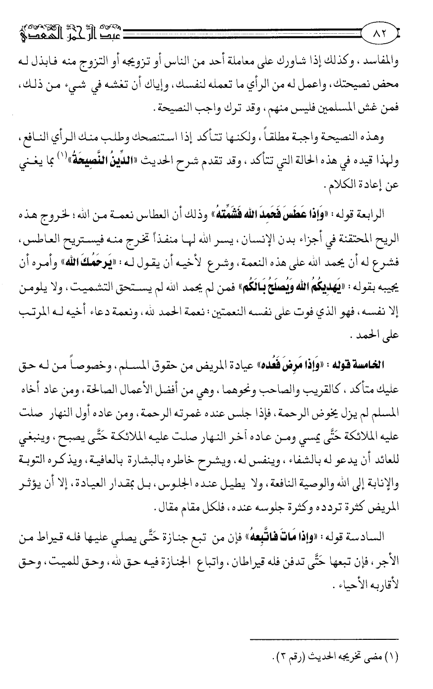 الرابعة: قوله: "وإذا عطس فحمد الله فشمته" وذلك أن العطاس نعمة من الله؛ لخروج هذه الريح المحتقنة في أجزاء بدن الإنسان، يسر الله لها منفذاً تخرج منه فيستريح العاطس. فشرع له أن يحمد الله على هذه النعمة. وشرع لأخيه أن يقول له: "يرحمك الله" وأمره أن يجيبه بقوله: "يهديكم الله ويصلح بالكم" فمن لم يحمد الله لم يستحق التشميت، ولا يلومن إلا نفسه. فهو الذي فوّت على نفسه النعمتين: نعمة الحمد لله، ونعمة دعاء أخيه له المرتب على الحمد.