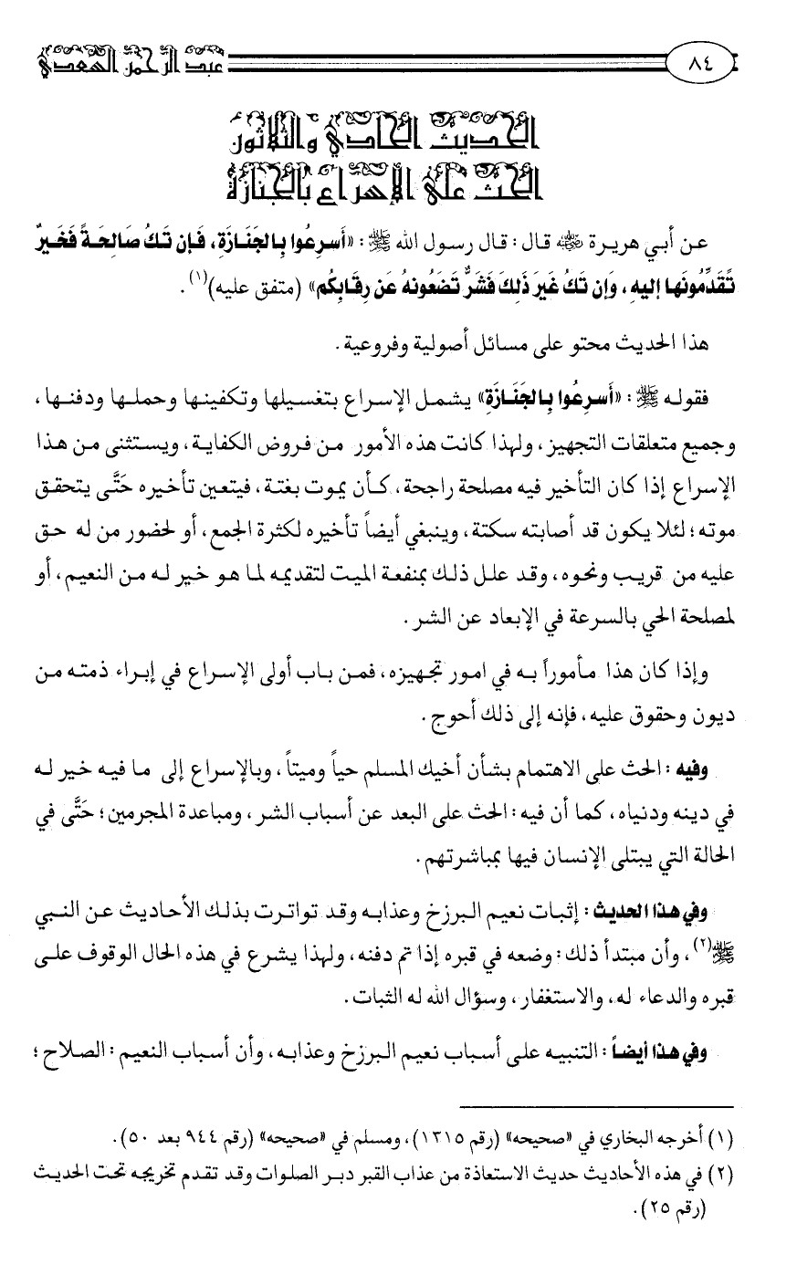 عَنْ أَبِي هُرَيْرَةَ رضي الله عنه قَالَ: قَالَ رَسُولُ اللَّهِ صلى الله عليه وسلم: "أَسْرِعُوا بِالْجِنَازَةِ. فَإِنْ تَكُ صَالِحَةً فَخَيْرٌ تقدمونها إليه. وإن تك غير ذَلِكَ فَشَرٌّ تَضَعُونَهُ عَنْ رِقَابِكُمْ" مُتَّفَقٌ عَلَيْهِ1.