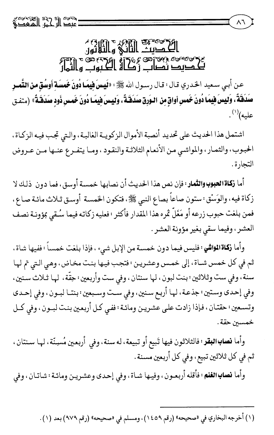 أما زكاة الحبوب والثمار: فإن نص هذا الحديث أن نصابها خمسة أوسق. فما دون ذلك لا زكاة فيه. والوَسْق: ستون صاعاً بصاع النبي صلّى الله عليه وسلم. فتكون الخمسة الأوسق ثلاثمائة صاع. فمن بلغت حبوب زرعه أو مَغَلَّ ثمره هذا المقدار فأكثر: فعليه زكاته فيما سُقي بمؤونة نصف العشر، وفيما سقي بغير مؤونة العشر.