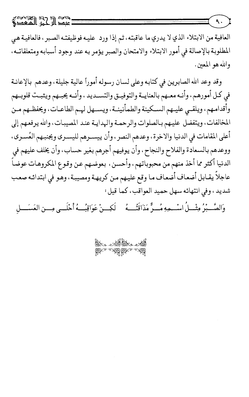 وقد وعد الله الصابرين في كتابه وعلى لسان رسوله أموراً عالية جليلة. وعدهم بالإعانة في كل أمورهم، وأنه معهم بالعناية والتوفيق والتسديد، وأنه يحبهم ويثبت قلوبهم وأقدامهم، ويلقي عليهم السكينة والطمأنينة، ويسهل لهم الطاعات، ويحفظهم من المخالفات، ويتفضل عليهم بالصلوات والرحمة والهداية عند المصيبات. والله يرفعهم إلى أعلى المقامات في الدنيا والآخرة. وعدهم النصر، وأن ييسرهم لليسرى ويجنبهم العُسرى. ووعدهم بالسعادة والفلاح والنجاح، وأن يوفيهم أجرهم بغير حساب، وأن يخلف عليهم في الدنيا أكثر مما أخذ منهم من محبوباتهم، وأحسن، يعوضهم عن وقوع المكروهات عوضاً عاجلاً يقابل أضعاف أضعاف ما وقع عليهم من كريهة ومصيبة. وهو في ابتدائه صعب شديد. وفي انتهائه سهل حميد العواقب كما قيل: