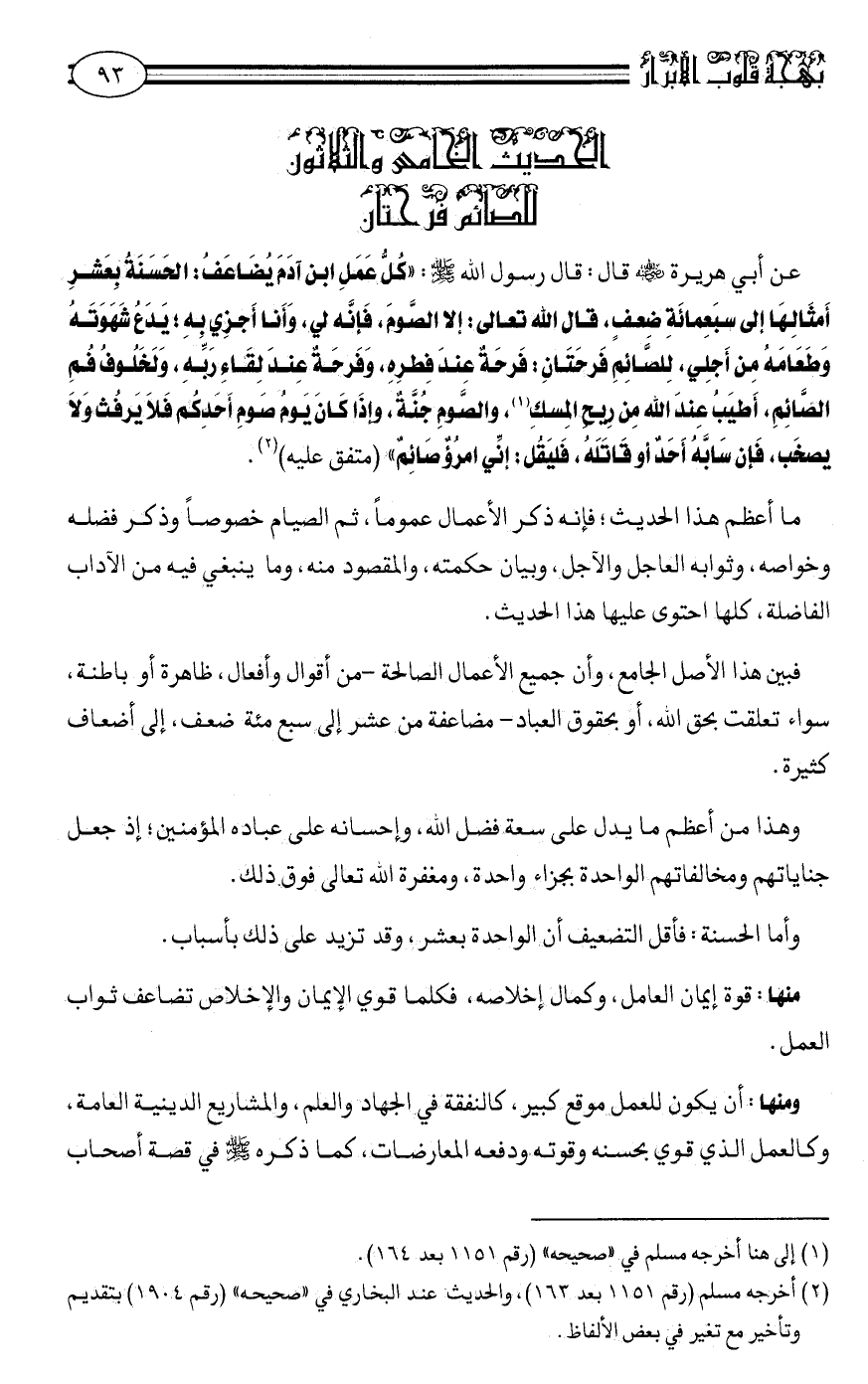 عن أبي هريرة رضي الله عنه قال: قال رسول الله صلى الله عليه وسلم: "كُلُّ عَمَلِ ابْنِ آدَمَ يُضَاعَفُ: الْحَسَنَةُ بِعَشْرِ أَمْثَالِهَا إِلَى سَبْعِمِائَةِ ضِعْفٍ. قَالَ اللَّهُ تَعَالَى: إِلَّا الصَّوْمَ. فَإِنَّهُ لِي، وَأَنَا أَجْزِي بِهِ؛ يَدَعُ شَهْوَتَهُ وَطَعَامَهُ مِنْ أَجْلِي. لِلصَّائِمِ فَرْحَتَانِ: فَرْحَةٌ عِنْدَ فِطْرِهِ، وَفَرْحَةٌ عِنْدَ لِقَاءِ رَبِّهِ. ولَخَلُوف فَمِ الصَّائِمِ أَطْيَبُ عِنْدَ اللَّهِ مِنْ رِيحِ الْمِسْكِ1. وَالصَّوْمُ جُنَّة. وَإِذَا كَانَ يَوْمُ صَوْمِ أَحَدِكُمْ فَلَا يَرْفُثْ وَلَا يَصْخَبْ، فَإِنْ سابَّه أَحَدٌ أَوْ قَاتَلَهُ، فَلْيَقُلْ: إِنِّي امْرُؤٌ صائم" متفق عليه2.