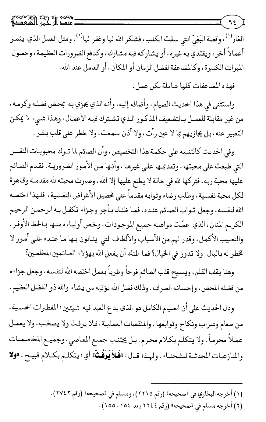 ودلّ الحديث على أن الصيام الكامل هو الذي يدع العبد فيه شيئين: المفطرات الحسية، من طعام وشراب ونكاح وتوابعها. والمنقصات العملية، فلا يرفث ولا يصخب، ولا يعمل عملاً محرماً، ولا يتكلم بكلام محرم. بل يجتنب جميع المعاصي، وجميع المخاصمات والمنازعات المحدثة للشحناء. ولهذا قال: "فلا يرفث" أي: لا يتكلم بكلام قبيح "ولا
