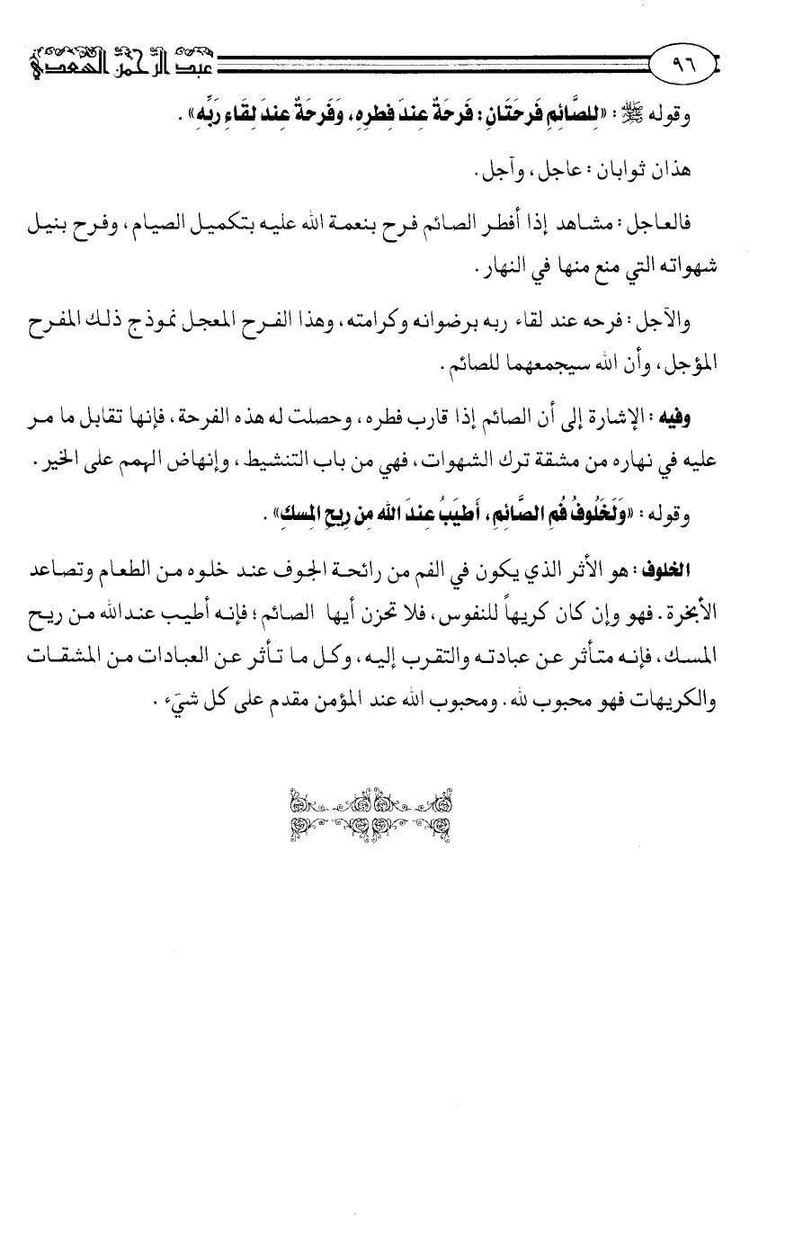 وقوله صلّى الله عليه وسلم: "لِلصَّائِمِ فَرْحَتَانِ: فَرْحَةٌ عِنْدَ فِطْرِهِ، وَفَرْحَةٌ عِنْدَ لقاء ربه".