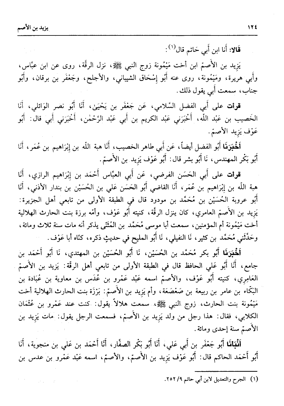 قالا أنا ابن أبي حاتم قال (1) يزيد بن الأصم ابن أخت ميمونة زوج النبي (صلى الله عليه وسلم) نزل الرقة روى عن ابن عباس وأبي هريرة وميمونة روى عنه أبو إسحاق الشيباني والأجلح وجعفر بن برقان وأبو جناب سمعت أبي يقول ذلك قرأت على أبي الفضل السلامي عن جعفر بن يحيى أنا أبو نصر الوائلي أنا الخصيب بن عبد الله أخبرني عبد الكريم بن أبي عبد الرحمن أخبرني أبي قال أبو عوف يزيد الأصم أخبرنا أبو الفضل أيضا عن أبي طاهر الخصيب أنا هبة الله بن إبراهيم بن عمر أنا أبو بكر المهندس نا أبو بشر قال أبو عوف يزيد بن الأصم قرأت على أبي الحسن الفرضي عن أبي العباس أحمد بن إبراهيم الرازي أنا هبة الله بن إبراهيم بن عمر أنا القاضي أبو الحسن علي بن الحسين بن بندار الأذني أنا أبو عروبة الحسين بن محمد بن مودود قال في الطبقة الأولى من تابعي أهل الجزيرة يزيد بن الأصم العامري كان ينزل الرقة كنيته أبو عوف وأمه برزة بنت الحارث الهلالية أخت ميمونة أم المؤمنين سمعت أبا موسى محمد بن المثنى يذكر أنه مات سنة ثلاث ومائة وحدثني محمد بن كثير نا النفيلي نا أبو المليح في حديث ذكره كناه أبا عوف أخبرنا أبو بكر محمد بن الحسين نا أبو الحسين بن المهتدي نا أبو أحمد بن جامع أنا أبو علي الحافظ قال في الطبقة الأولى من تابعي أهل الرقة يزيد بن الأصم العامري كنيته أبو عوف والأصم اسمه عبد عمرو بن عدس بن معاوية بن عبادة بن البكاء بن عامر بن ربيعة بن صعصعة وأم يزيد بن الأصم برزة بنت الحارث الهلالية أخت ميمونة بنت الحارث زوج النبي (صلى الله عليه وسلم) سمعت هلالا يقول كنت عند عمرو بن عثمان الكلابي فقال هذا رجل من ولد يزيد بن الأصم فسمعت الرجل يقول مات يزيد بن الأصم سنة إحدى ومائة أنبأنا أبو جعفر بن أبي علي انا أبو بكر الصفار أنا أحمد بن علي بن منجوية أنا أبو أحمد الحاكم قال أبو عورف يزيد بن الأصم والأصم اسمه عبد عمرو بن عدس بن