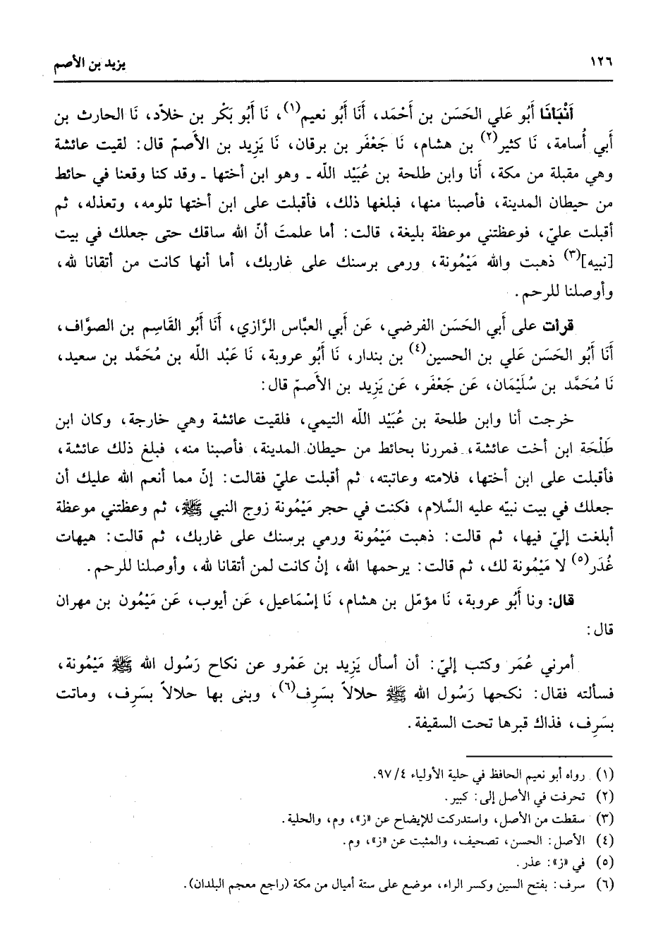 أنبأنا أبو علي الحسن بن أحمد أنا أبو نعيم (1) نا أبو بكر بن خلاد نا الحارث بن أبي أسامة نا كثير (2) بن هشام نا جعفر بن برقان نا يزيد بن الأصم قال لقيت عائشة وهي مقبلة من مكة أنا وابن طلحة بن عبيد الله وهو ابن أختها وقد كنا في حائط من حيطان المدينة فأصبنا منها فبلغها ذلك فأقبلت على ابن أختها تلومه وتعذله ثم أقبلت علي فوعظتني موعظة بليغة قالت أما علمت أن الله ساقك حتى جعلك في بيت نبيه (3) ذهبت والله ميمونة ورمى برسنك على غاربك أما أنها كانت من أتقانا لله وأوصلنا للرحم قرأت على أبي الحسن الفرضي عن أبي العباس الرازي أنا أبو القاسم بن الصواف أنا أبو الحسن علي بن الحسين (4) بن بندار نا أبو عروبة نا عبد الله بن محمد بن سعيد نا محمد بن سليمان عن جعفر عن يزيد بن الأصم قال خرجت أنا وابن طلحة بن عبيد الله التيمي فلقيت عائشة وهي خارجة وكان ابن طلحة ابن أخت عائشة فمررنا بحائط من حيطان المدينة فأصبنا منه فبلغ ذلك عائشة فأقبلت على ابن أختها فلامته وعاتبته ثم أقبلت علي فقالت إن مما أنعم الله عليك أن جعلك علك في بيت نبيه عليه السلام فكنت في حجر ميمونة زوج النبي (صلى الله عليه وسلم) ثم وعظتني موعظة أبلغت إلي فيها ثم قالت ذهبت ميمونة ورمي برسنك على غاربك ثم قالت هيهات غدر (5) لاميمونة لك ثم قالت يرحمها الله إن كانت لمن أتقانا لله وأوصلنا للرحم قال ونا أبو عروبة نا مؤمل بن هشام نا إسماعيل عن أيوب عن ميمون بن مهران قال أمرني عمر وكتب إلي أن أسأل يزيد بن عمرو عن نكاح رسول الله (صلى الله عليه وسلم) ميمونة فسألته فقال نكحها رسول الله (صلى الله عليه وسلم) حلالا بسرف (6) وبنى بها حلالا بسرف وماتت بسرف فذاك قبرها تحت السقيفة