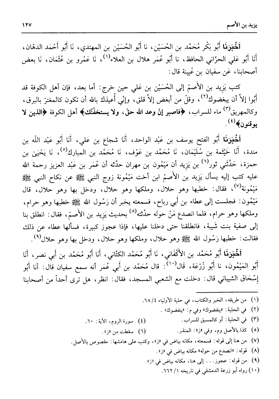 أخبرنا أبو بكر محمد بن الحسين نا أبو الحسين بن المهتدي نا أبو أحمد الدهان أنا أبو علي الحراني الحافظ نا أبو عمر هلال بن العلاء (1) نا عمرو بن عثمان نا بعض أصحابنا عن سفيان بن عيينة قال كتب يزيد بن الأصم إلى الحسين بن علي حين خرج أما بعد فإن أهل الكوفة قد أبوا إلا أن يبغضوك (2) وقل من أبغض إلا قلق وإني أعيذك بالله أن تكون كالمغتر بالبرق وكالمهريق (3) ماء للسراب " فاصبر إن وعد الله حق ولا يستخفنك " أهل الكوفة " الذين لا يوقنون (4) " أخبرنا أبو الفتح يوسف بن عبد الواحد أنا شجاع بن علي أنا أبو عبد الله بن مندة أنا خيثمة بن سليمان نا محمد بن عوف نا محمد بن المبارك (5) نا يحيى بن حمزة حدثني ثور (6) بن يزيد أن ميمون بن مهران حدثه أن عمر بن عبد العزيز رحمة الله عليه كتب إليه يسأل يزيد بن الأصم ابن أخت ميمونة (7) زوج النبي (صلى الله عليه وسلم) عن نكاح النبي (صلى الله عليه وسلم) ميمونة فقال خطبها وهو حلال وملكها وهو حلال ودخل بها وهو حلال قال ميمون فجلست إلى عطاء بن أبي رباح فسمعته يخبر أن رسول الله (صلى الله عليه وسلم) خطبها وهو حرام وملكها وهو حرام فلما انصدع من حوله حدثته (8) بحديث يزيد بن الأصم فقال انطلق بنا إلى صفية بنت شيبة فانطلقنا حتى دخلنا عليها فإذا عجوز كبيرة فسألها عطاء عن ذلك فقالت خطبها رسول الله (صلى الله عليه وسلم) وهو حلال وملكها وهو حلال ودخل بها وهو حلال (9) أخبرنا أبو محمد بن الأكفاني نا أبو محمد الكتاني أنا أبو محمد بن أبي نصر أنا أبو الميمون نا أبو زرعة قال (10) قال محمد بن أبي عمر أنه سمع سفيان قال أنا أبو إسحاق الشيباني قال دخلت مع الشعبي المسجد فقال انظر هل ترى أحدا من أصحابنا