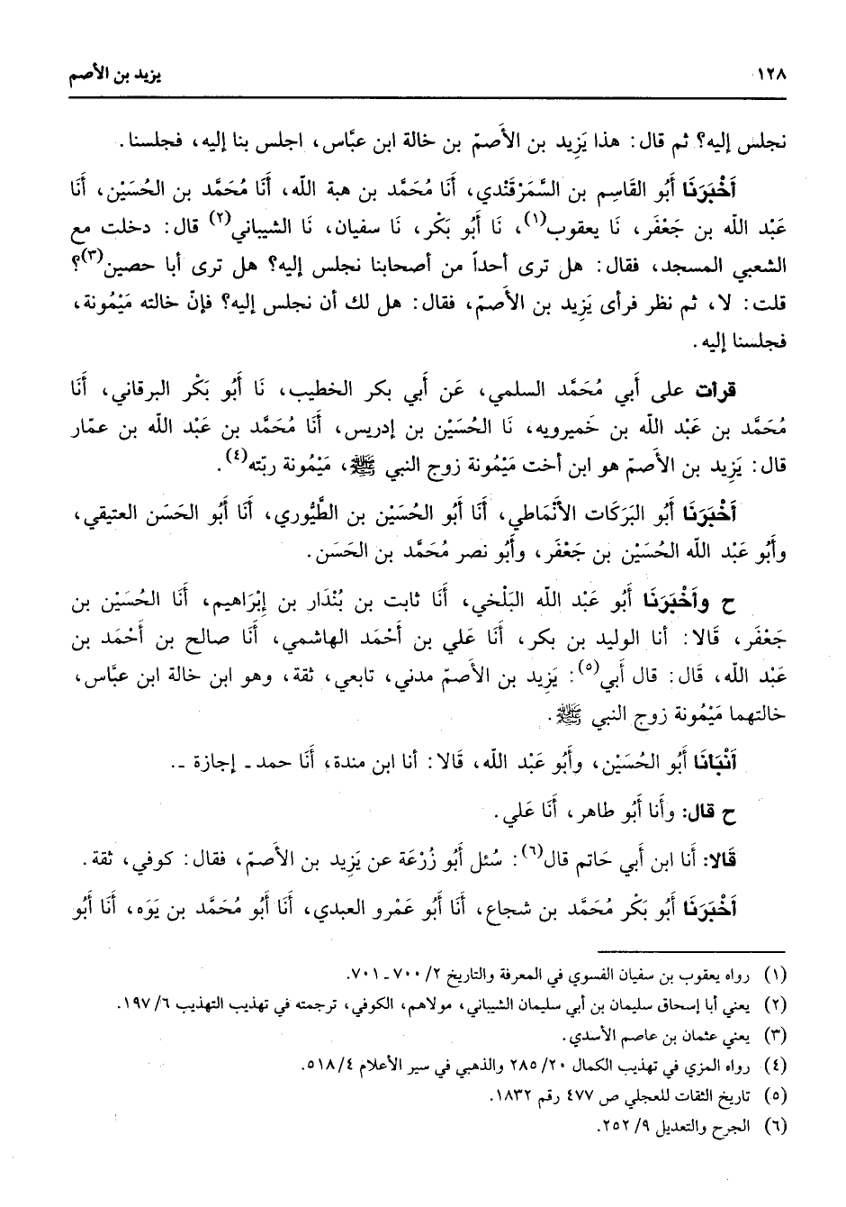 نجلس إليه ثم قال هذا يزيد بن الأصم بن خالة ابن عباس اجلس بنا إليه فجلسنا أخبرنا أبو القاسم بن السمرقندي أنا محمد بن هبة الله أنا محمد بن الحسين أنا عبد الله بن جعفر نا يعقوب (1) نا أبو بكر نا سفيان نا الشيباني (2) قال دخلت مع الشعبي المسجد فقال هل ترى أحدا من أصحابنا نجلس إليه هل ترى أبا حصين (3) قلت لا ثم نظر فرأى يزيد بن الأصم فقال هل لك أن نجلس إليه فإن خالته ميمونة فجلسنا إليه قرأت على أبي محمد السلمي عن أبي بكر الخطيب نا أبو بكر البرقاني أنا محمد بن عبد الله بن خميرويه نا الحسين بن إدريس أنا محمد بن عبد الله بن عمار قال يزيد بن الأصم هو ابن أخت ميمونة زوج النبي (صلى الله عليه وسلم) ميمونة ربته (4) أخبرنا أبو البركات الأنماطي أنا أبو الحسين بن الطيوري أنا أبو الحسن العتيقي وأبو عبد الله الحسين بن جعفر وأبو نصر محمد بن الحسن ح وأخبرنا أبو عبد الله البلخي أنا ثابت بن بندار بن إبراهيم أنا الحسين بن جعفر قالا أنا الوليد بن بكر أنا علي بن أحمد الهاشمي أنا صالح بن أحمد بن عبد الله قال قال أبي (5) يزيد بن الأصم مدني تابعي ثقة وهو ابن خالة ابن عباس خالتهما ميمونة زوج النبي (صلى الله عليه وسلم) أنبأنا أبو الحسين وأبو عبد الله قالا أنا ابن مندة أنا حمد إجازة ح قال وأنا أبو طاهر أنا علي قالا أنا ابن أبي حاتم (6) قال سئل أبو زرعة عن يزيد بن الأصم فقال كوفي ثقة أخبرنا أبو بكر محمد بن شجاع أنا أبو عمرو العبدي أنا أبو محمد بن يوه أنا أبو