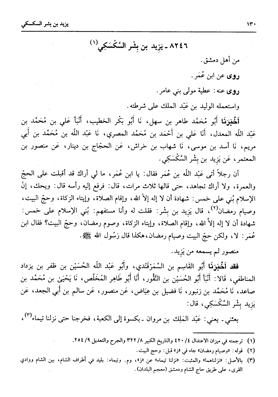 8246 - يزيد بن بشر السكسكي (1) من أهل دمشق روى عن ابن عمر روى عنه عطية مولى بني عامر واستعمله الوليد بن عبد الملك على شرطته أخبرنا أبو محمد طاهر بن سهل نا أبو بكر الخطيب أنبأ علي بن محمد بن عبد الله المعدل أنا علي بن أحمد بن محمد المصري نا عبد الله بن محمد بن أبي مريم نا أسد بن موسى نا شهاب بن خراش عن الحجاج بن دينار عن منصور بن المعتمر عن يزيد بن بشر السكسكي أن رجلا أتى عبد الله بن عمر فقال يا ابن عمر ما لي أراك قد أقبلت على الحج والعمرة ولا أراك تجاهد حتى قالها ثلاث مرات قال فرفع إليه رأسه قال ويحك إن الإسلام بني على خمس شهادة أن لاإله إلا الله وإقام الصلاة وإيتاء الزكاة وحج البيت وصيام رمضان (2) قال يزيد بن بشر فقلت له وأنا مستفهم بني الإسلام على خمس شهادة إن لا إله إلا الله وإقام الصلاة وإيتاء الزكاة وصوم رمضان وحج البيت فقال ابن عمر لا ولكن حج البيت وصيام رمضان هكذا قال رسول الله (صلى الله عليه وسلم) منصور لم يسمعه من يزيد فقد أخبرنا أبو القاسم بن السمرقندي وأبو عبد الله الحسين بن ظفر بن يزداد المناطفي قالا أنبأ أبو الحسين بن النقور أنا أبو طاهر المخلص نا يحيى بن محمد بن صاعد نا محمد بن زنبور نا فضيل بن عياض عن منصور عن سالم بن أبي الجعد عن يزيد بشر السكسكي قال بعثني يعني عبد الملك بن مروان بكسوة إلى الكعبة فخرجنا حتى نزلنا تيماء (3)