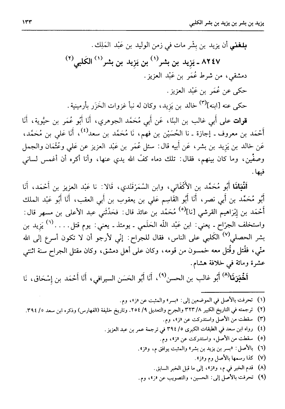 8247 - يزيد بن بشر (1) بن يزيد بن بشر (1) الكلبي (2) دمشقي من شرط عمر بن عبد العزيز حكى عن عمر بن عبد العزيز حكى عنه ابنه (3) خالد بن يزيد وكان له نبأ غزوات الخزر بأرمينية قرأت على أبي غالب بن البنا عن أبي محمد الجوهري أنا أبو عمر بن حيوية أنا أحمد بن معروف إجازة نا الحسين بن فهم نا محمد بن سعد (4) أنا علي بن محمد عن خالد بن يزيد بن بشر عن أبيه قال سئل عمر بن عبد العزيز عن علي وعثمان والجمل وصفين وما كان بينهم فقال تلك دماء كف الله يدي عنها وأنا أكره أن أغمس لساني فيها أنبأنا أبو محمد بن الأكفاني وابن السمرقندي قالا نا عبد العزيز بن أحمد أنا أبو محمد بن أبي نصر أنا أبو القاسم علي بن يعقوب بن أبي العقب أنا أبو عبد الملك أحمد بن إبراهيم القرشي (5) نا محمد بن عائذ قال فحدثني عبد الأعلى بن مسهر قال واستخلف الجراح يعني ابن عبد الله الحلمي يومئذ يعني يوم قتل يزيد (6) بن بشر الحصلي (7) الكلبي على الناس فقال للجراح إني لأرجو أن تكون أسرع إلى الله مني فقتل وقتل معه خمسون من قومه وكان على أهل دمشق وكان مقتل الجراح سنة اثنتي عشرة ومائة في خلافة هشام أخبرنا (8) أبو غالب بن الحسن أنا أبو الحسن (9) السيرافي أنا