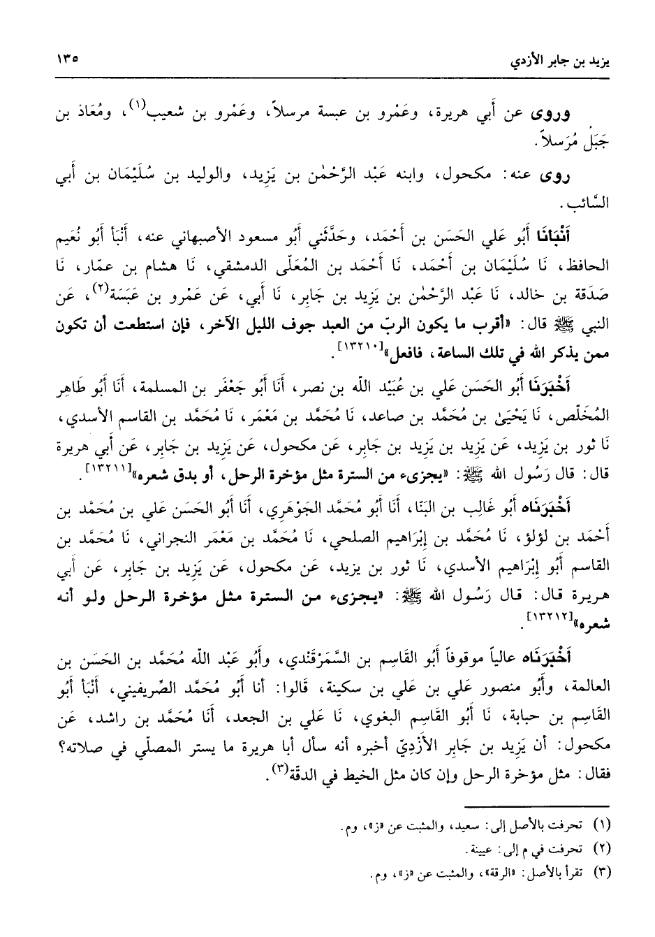 وروى عن أبي هريرة وعمرو بن عبسة مرسلا وعمرو بن شعيب (1) ومعاذ بن جبل مرسلا روى عنه مكحول وابنه عبد الرحمن بن يزيد والوليد بن سليمان بن أبي السائب أنبأنا أبو علي الحسن بن أحمد وحدثني أبو مسعود الأصبهاني عنه أنبأ أبو نعيم الحافظ نا سليمان بن أحمد نا أحمد بن المعلى الدمشقي نا هشام بن عمار نا صدقة بن خالد نا عبد الرحمن بن يزيد بن جابر نا أبي عن عمرو بن عبسة (2) عن النبي (صلى الله عليه وسلم) قال أقرب ما يكون الرب من العبد جوف الليل الآخر فإن استطعت أن تكون ممن يذكر الله في تلك الساعة فافعل أخبرنا أبو الحسن علي بن عبيد الله بن نصر أنا أبو جعفر بن المسلمة أنا أبو طاهر المخلص نا يحيى بن محمد بن صاعد نا محمد بن معمر نا محمد بن القاسم الأسدي ناثور بن يزيد عن يزيد بن يزيد بن جابر عن مكحول عن يزيد بن جابر عن أبي هريرة قال قال رسول الله (صلى الله عليه وسلم) يجزئ من السترة مثل مؤخرة الرحل أو بدق شعره أخبرناه أبو غالب بن البنا أنا أبو محمد الجوهري أنا أبو الحسن علي بن محمد بن أحمد بن لؤلؤ نا محمد بن إبراهيم الصلحي نا محمد بن معمر النجراني نا محمد بن القاسم أبو إبراهيم الأسدي نا ثور بن يزيد عن مكحول عن يزيد بن جابر عن أبي هريرة قال قال رسول الله (صلى الله عليه وسلم) يجزئ من السترة مثل مؤخرة الرحل ولو أنه شعره أخبرناه عاليا موقوفا أبو القاسم بن السمرقندي وأبو عبد الله محمد بن الحسن بن العالمة وأبو منصور علي بن علي بن سكينة قالوا أنا أبو محمد الصريفيني أنبأ أبو القاسم بن حبابة نا أبو القاسم البغوي نا علي بن الجعد أنا محمد بن راشد عن مكحول أن يزيد بن جابر الأزدي أخبره أنه سأل أبا هريرة ما يستر المصلي في صلاته فقال مثل مؤخرة الرحل وإن كان مثل الخيط في الدقة (3)