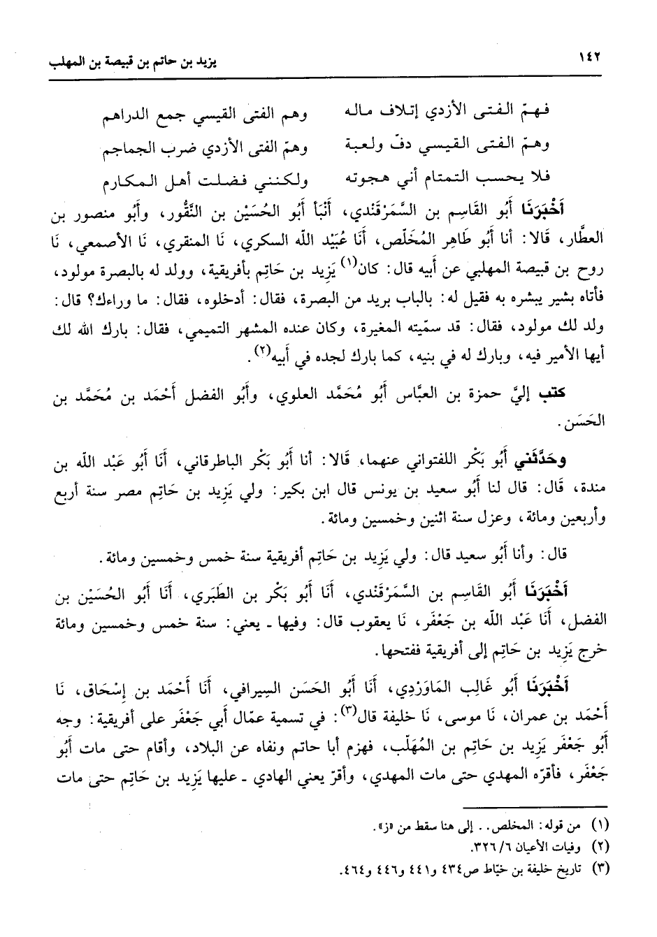 فهم الفتى الأزدي إتلاف ماله * وهم الفتى القيسي جمع الدراهم وهم الفتى القيسي دف ولعبة * وهم الفتى الأزدي ضرب الجماجم فلا يحسب التمتام أني هجوته * ولكنني فضلت أهل المكارم * أخبرنا أبو القاسم بن السمرقندي أنبأ أبو الحسين بن النقور وأبو منصور بن العطار قالا أنا أبو طاهر المخلص أنا عبيد الله السكري نا المنقري نا الأصمعي نا روح بن قبيصة المهلبي عن أبيه قال كان (1) يزيد بن حاتم بأفريقية وولد له بالبصرة مولود فأتاه بشير يبشره به فقيل له بالباب بريد من البصرة فقال أدخلوه فقال ما وراءك قال ولد لك مولود فقال قد سميته المغيرة وكان عنده المشهر التميمي فقال بارك الله لك أيها الأمير فيه وبارك له في بنيه كما بارك لجده في أبيه (2) كتب إلي حمزة بن العباس أبو محمد العلوي وأبو الفضل أحمد بن محمد بن الحسن وحدثني أبو بكر اللفتواني عنهما قالا أنا أبو بكر الباطرقاني أنا أبو عبد الله بن مندة قال قال لنا أبو سعيد بن يونس قال ابن بكير ولي يزيد بن حاتم مصر سنة أربع وأربعين ومائة وعزل سنة اثنين وخمسين ومائة قال وأنا أبو سعيد قال ولي يزيد بن حاتم أفريقية سنة خمس وخمسين ومائة أخبرنا أبو القاسم بن السمرقندي أنا أبو بكر بن الطبري أنا أبو الحسين بن الفضل أنا عبد الله بن جعفر نا يعقوب قال وفيها يعني سنة خمس وخمسين ومائة خرج يزيد بن حاتم إلى أفريقية ففتحها أخبرنا أبو غالب الماوردي أنا أبو الحسن السيرافي أنا أحمد بن إسحاق نا أحمد بن عمران نا موسى نا خليفة قال (3) في تسمية عمال أبي جعفر على أفريقية وجه أبو جعفر يزيد بن حاتم بن المهلب فهزم أبا حاتم ونفاه عن البلاد وأقام حتى مات أبو جعفر فأقره المهدي حتى مات المهدي وأقر يعني الهادي عليها يزيد بن حاتم حتى مات