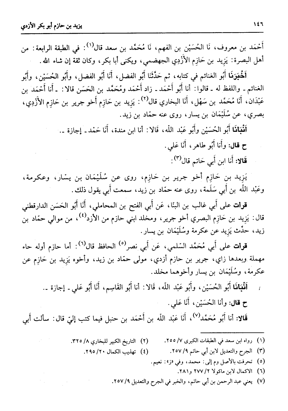 / أحمد بن معروف نا الحسين بن الفهم نا محمد بن سعد (1) قال في الطبقة الرابعة من ح ح أهل البصرة يزيد بن حازم الأزدي الجهضمي ويكنى أبا بكر وكان ثقة إن شاء الله أخبرنا أبو الغنائم في كتابه ثم حدثنا أبو الفضل أنا أبو الفضل وأبو الحسين وأبو الغنائم واللفظ له قالوا أنا أبو أحمد زاد أحمد ومحمد بن الحسن قالا أنا أحمد بن عبدان أنا محمد بن سهل أنا البخاري قال (2) يزيد بن حازم أخو جرير بن حازم الأزدي بصري عن سليمان بن يسار روى عنه حماد بن زيد أنبأنا أبو الحسين وأبو عبد الله قالا أنا ابن مندة أنا حمد إجازة ح قال وأنا أبو طاهر أنا علي قالا أنا ابن أبي حاتم قال (3) يزيد بن حازم أخو جرير بن حازم روى عن سليمان بن يسار وعكرمة وعبد الله بن أبي سلمة روى عنه حماد بن زيد سمعت أبي يقول ذلك قرأت على أبي غالب بن البنا عن أبي الفتح بن المحاملي أنا أبو الحسن الدارقطني قال يزيد بن حازم البصري أخو جرير ومخلد ابني حازم من الأزد (4) من موالي حماد بن زيد حدث يزيد عن عكرمة وسليمان بن يسار قرأت على أبي محمد السلمي عن أبي نصر (5) الحافظ قال (6) أما حازم أوله حاء مهملة وبعدها زاي جرير بن حازم أزدي مولى حماد بن زيد وأخوه يزيد بن حازم عن عكرمة وسليمان بن يسار وأخوهما مخلد أنبأنا أبو الحسين وأبو عبد الله قالا أنا أبو القاسم أنا أبو علي إجازة ح قال وأنا الحسين أنا علي قالا أنا أبو محمد (7) أنا عبد الله بن أحمد بن حنبل فيما كتب إلي قال سألت أبي