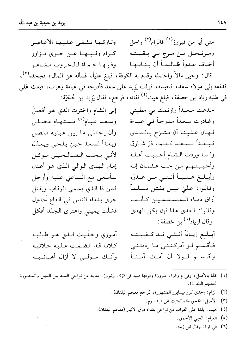 متى أيا من فيروز (1) فالزام (2) راحل وتاركها تشفى عليها الأعاصر ومرتحل من مرج لي بقيته * كرام وفيها عن حوى تزاور أخاف عدوا ظالما أن ينالها * وفيها حماة للحروب مشاعر * قال وجبى مالا واحتمله وقدم به الكوفة فبلغ عليا فسأله عن المال فجحده (3) فدفعه إلى مولاه سعد فحبسه فوثب يزيد على سعد فأدرجه في عباءة وهرب فبعث علي في طلبه زياد بن خصفة فبلغ (4) هيت ففاته فرجع فقال يزيد بن حجية خدعت سعيدا وارتمت بي مطيتي * إلى الشام واخترت الذي هو أفضل وغادرت سعدا مدرجا في عباءة * وسعد عبام (5) مستهام مضلل فهان علينا أن يشرح بالمدى * وأن يجتلى ما بين عينيه منصل فبعدا لسعد كلما ذر شارق * وبعدا لسعد حين يلحى ويعذل ولما وردت الشام أحببت أهله * لأني بحب الصالحين موكل وأحببتهم من حب عثمان إنه * إمام الهدى الوالي الذي هو أعدل وأبلغ علينا أنني من عدوه * سأسعى مع الساعي عليه وأرحل وقالوا علي ليس يقتل مسلما * فمن ذا الذي يسمي الرقاب ويقتل أراق دماء المسلمين كأنما * جرى بدماء الناس في القاع جدول وقالوا العدى هذا فإن يكن الهدى * فشلت يميني واعترى الجلد أفكل * وقال لزياد (6) بن خصفة أبلغ زيادا أنني قد كفيته * أموري وخليت الذي هو طالبه فأقسم لو أدركتني ما رددتني * كلانا قد انضمت عليه جلائبه وأقسم لولا أن أمك آمنا * وأنك مولى لا أزال أعاتبه