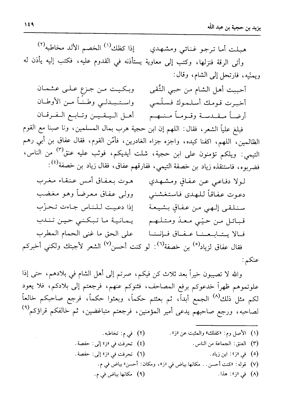 هبلت أما ترجو غنائي ومشهدي * إذا كظك (1) الخصم الألد مخاطبه (2) وأتى الرقة فنزلها وكتب إلى معاوية يستأذنه في القدوم عليه فكتب إليه يأذن له ويمنيه فارتحل إلى الشام وقال أحببت أهل الشام من حبي التقى * وبكيت من جزع على عثمان أخبرت قومك أسلموك فسلمي * واستبدلي وطنا من الأوطان أرضا مقدسة وقوما منهم * أهل اليقين وتابع الفرقان * فبلغ عليا الشعر فقال اللهم إن ابن حجية هرب بمال المسلمين وناصبنا مع القوم الظالمين اللهم اكفنا كيده واجزه جزاء الغادرين فأمن القوم فقال عفاق بن أبي رهم التيمي ويلكم تؤمنون على ابن حجية شلت أيديكم فوثب عليه عنق (3) من الناس فضربوه فاستنقذه زياد بن خصفة التيمي ففارقهم عفاق فقال زياد بن خصفة (4) لولا دفاعي عن عفاق ومشهدي * هوت بعفاق أمس عنقاء مغرب دعوت عفاقا للهدى فاستغشني * وولى عفاق معرضا وهو مغضب سنلقي إلهي من عفاق بشيعة * إذا دعيت للناس جاءت تحزب قبائل من حيي معد ومتلهم * يمانية ما تبكني حين تندب فالا يتابعنا عفاق فإننا * على الحق ما غنى الحمام المطرب * فقال عفاق لزياد (5) بن خصفة (6) لو كنت أحسن (7) الشعر لأجبتك ولكني أخبركم عنكم والله لا تصيبون خيرا بعد ثلاث كن فيكم صرتم إلى أهل الشام في بلادهم حتى إذا علوتموهم ظهرا خدعوكم برفع المصاحف فثنوكم عنهم فرجعتم إلى بلادكم فلا يعود لكم مثل ذلك (8) الجمع أبدا ثم بعثتم حكما وبعثوا حكما فرجع صاحبكم خالعا لصاحبه ورجع صاحبهم يدعى أمير المؤمنين فرجعتم متباغضين ثم خالفكم قراؤكم (9)