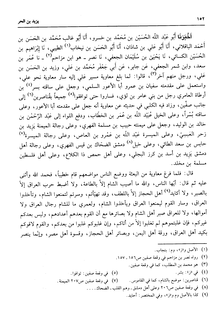 أخبرنا أبو عبد الله الحسين بن محمد بن خسرو أنا أبو غالب محمد بن الحسن بن أحمد الباقلاني أنا أبو علي بن شاذان أنا أبو الحسن بن نيخاب (1) الطيبي نا إبراهيم بن الحسين الكسائي نا يحيى بن سليمان الجعفي نا نصر هو ابن مزاحم (2) نا عمر بن سعد وابن شمر الجعفي عن جابر عن أبي جعفر محمد بن علي وزيد بن الحسن بن علي ورجل منهم آخر (3) قالوا لما بلغ معاوية مسير علي إليه سار معاوية نحو علي واستعمل على مقدمته سفيان بن عمرو أبا الأعور السلمي وجعل على ساقته بسر (4) بن أرطاة العامري رجل من بني عامر بن لؤي فساروا حتى توافقوا (5) جميعا بقناصرين (6) إلى جانب صفين وزاد فيه الكلبي في حديثه عن معاوية أنه جعل على مقدمته أبا الأعور وعلى ساقته بسرا وعلى الخيل عبيد الله بن عمر بن الخطاب ودفع اللواء إلى عبد الرحمن بن خالد بن الوليد وجعل على ميمنته حبيب بن مسلمة الفهري وعلى رجالة الميمنة يزيد بن زحر العبسي وعلى الميسرة عبد الله بن عمرو بن العاص وعلى رجالة الميسرة (7) حابس بن سعد الطائي وعلى خيل (8) دمشق الضحاك بن قيس الفهري وعلى رجالة أهل دمشق يزيد بن أسد بن كرز البجلي وعلى أهل حمص ذا الكلاع وعلى أهل فلسطين مسلمة بن مخلد قال فلما فرغ معاوية من البعثة ووضع الناس مواضعهم قام خطيبا فحمد الله وأثنى عليه ثم قال أيها الناس والله ما أصيب الشام إلا بالطاعة ولا أضبط حرب العراق إلا بالصبر ولا أكايد (9) أهل الحجاز إلا باللطف وقد تهيأتم وسرتم لتمنعوا الشام وتأخذوا العراق وسار القوم ليمنعوا العراق ويأخذوا الشام ولعمري ما للشام رجال العراق ولا أموالها ولا للعراق صبر أهل الشام ولا بصائرها مع أن القوم بعدهم أعدادهم وليس بعدكم غيركم فإن غلبتموهم لم تغلبوا إلا من أتاكم وإن غلبوكم غلبوا من بعدكم والقوم لاقوكم بكيد أهل العراق ورقة أهل اليمن وبصائر أهل الحجاز وقسوة أهل مصر وإنما ينصر
