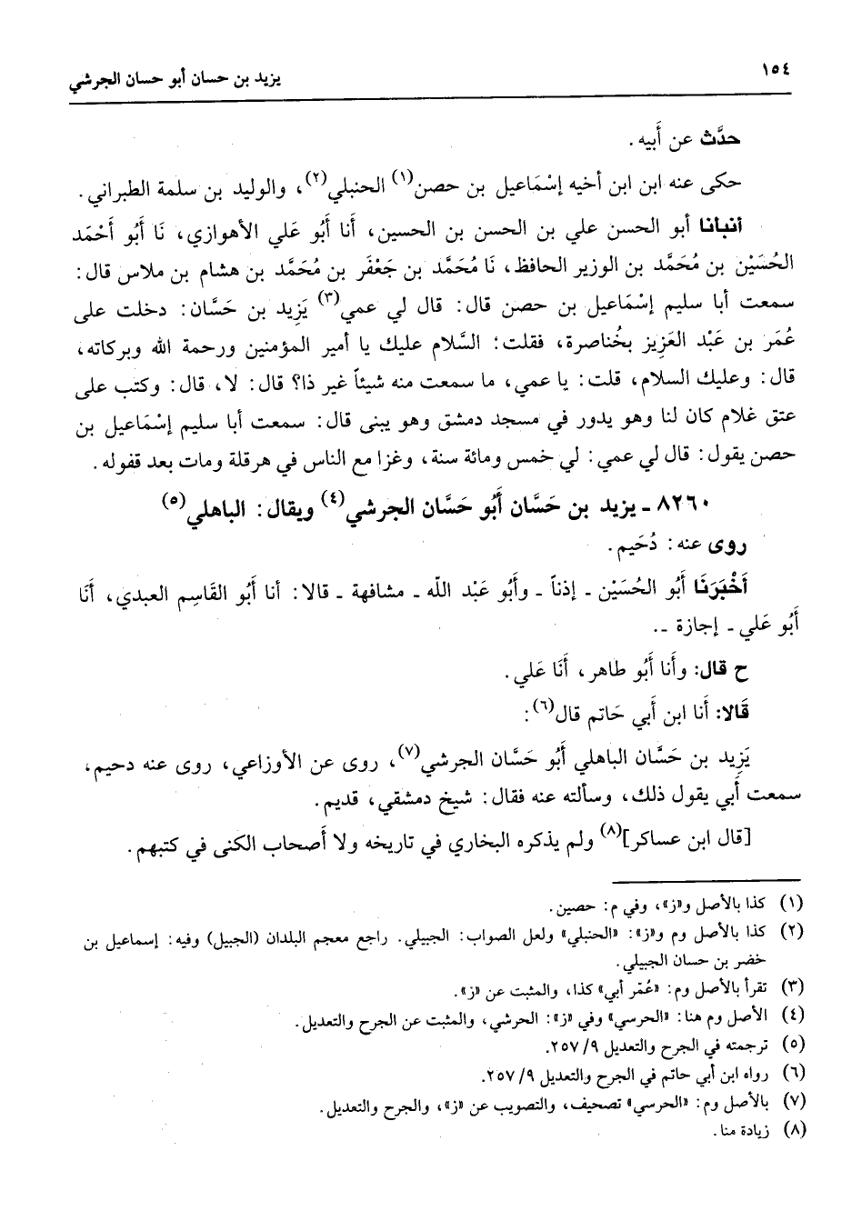 8260 - يزيد بن حسان أبو حسان الجرشي (4) ويقال الباهلي (5) روى عنه دحيم أخبرنا أبو الحسين إذنا وأبو عبد الله مشافهة قالا أنا أبو القاسم العبدي أنا أبو علي إجازة ح قال وأنا أبو طاهر أنا علي قالا أنا ابن أبي حاتم قال (6) يزيد بن حسان الباهلي أبو حسان الجرشي (7) روى عن الأوزاعي روى عنه دحيم سمعت أبي يقول ذلك وسألته عنه فقال شيخ دمشقي قديم قال ابن عساكر (8) ولم يذكره البخاري في تاريخه ولا أصحاب الكنى في كتبهم