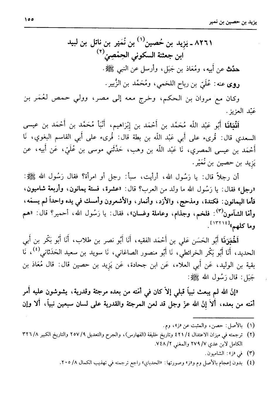 8261 - يزيد بن حصين (1) بن نمير بن ناتل ابن لبيد بن جعثنة السكوني الحمصي (2) حدث عن أبيه ومعاذ بن جبل وأرسل عن النبي (صلى الله عليه وسلم) روى عنه علي بن رباح اللخمي ومحمد بن الزبير وكان مع مروان بن الحكم وخرج معه إلى مصر وولي حمص لعمر بن عبد العزيز أنبأنا أبو عبد الله محمد بن أحمد بن إبراهيم أنبأ محمد بن أحمد بن عيسى السعدي قال قرئ على أبي عبد الله بن بطة قال قرئ على أبي القاسم البغوي نا أحمد بن عيسى المصري نا عبد الله بن وهب حدثني موسى بن علي عن أبيه عن يزيد بن حصين بن نمير أن رجلا قال يا رسول الله أرأيت سبأ رجل أو امرأة فقال رسول الله (صلى الله عليه وسلم) رجل [* *] فقال يا رسول الله ما ولد من العرب قال عشرة فستة يمانون وأربعة شاميون فأما اليمانون فكندة ومذحج والأزد وأنمار والأشعرون وأمسك في يده واحدا لم يسمه وأما الشآمون (3) فلخم وجذام وعاملة وغسان فقال يا رسول الله أحمير قال هم وماكلهم أخبرنا أبو الحسن علي بن أحمد الفقيه أنا أبو نصر بن طلاب أنا أبو بكر بن أبي الحديد أنا أبو بكر الخرائطي نا أبو منصور الصاغاني نا سويد بن سعيد الحدثاني (4) نا بقية بن الوليد عن أبي العلاء عن ابن جحادة عن يزيد بن حصين قال قال معاذ بن جبل قال رسول الله (صلى الله عليه وسلم) إن الله لم يبعث نبيا قبلي إلا كان في أمته من بعده مرجئة وقدرية يشوشون عليه أمر