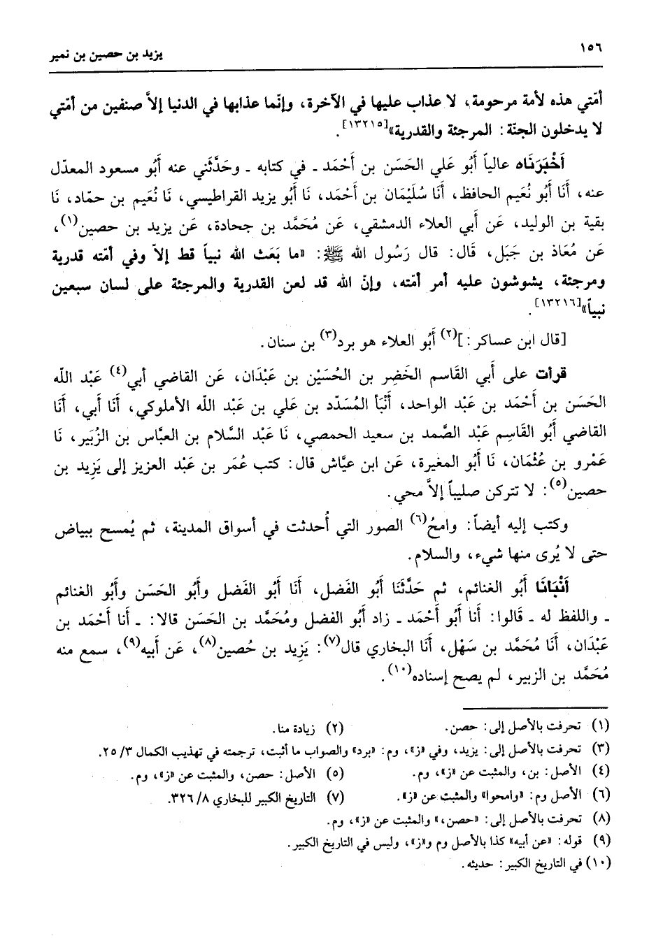أمته من بعده ألا إن الله عز وجل قد لعن المرجئة والقدرية على لسان سبعين نبيا ألا وإن أمتي هذه لأمة مرحومة لا عذاب عليها في الآخرة وإنما عذابها في الدنيا إلا صنفين من أمتي لا يدخلون الجنة المرجئة والقدرية أخبرناه عاليا أبو علي الحسن بن أحمد في كتابه وحدثني عنه أبو مسعود المعدل عنه أنا أبو نعيم الحافظ أنا سليمان بن أحمد نا أبو يزيد القراطيسي نا نعيم بن حماد نا بقية بن الوليد عن أبي العلاء الدمشقي عن محمد بن جحادة عن يزيد بن حصين (1) عن معاذ بن جبل قال قال رسول الله (صلى الله عليه وسلم) ما بعث الله نبيا قط إلا وفي أمته قدرية ومرجئة يشوشون عليه أمر أمته وإن الله قد لعن القدرية والمرجئة على لسان سبعين نبيا قال ابن عساكر (2) أبو العلاء هو برد (3) بن سنان قرأت على أبي القاسم الخضر بن الحسين بن عبدان عن القاضي أبي (4) عبد الله الحسن بن أحمد بن عبد الواحد أنبأ المسدد بن علي بن عبد الله الأملوكي أنا أبي أنا القاضي أبو القاسم عبد الصمد بن سعيد الحمصي نا عبد السلام بن العباس بن الزبير نا عمرو بن عثمان نا أبو المغيرة عن ابن عياش قال كتب عمر بن عبد العزيز إلى يزيد بن حصين (5) لا تتركن صليبا إلا محي وكتب إليه أيضا وامح (6) الصور التي أحدثت في أسواق المدينة ثم يمسح ببياض حتى لا يرى منها شئ والسلام أنبأنا أبو الغنائم ثم حدثنا أبو الفضل أنا أبو الفضل وأبو الحسن وأبو الغنائم واللفظ له قالوا أنا أبو أحمد زاد أبو الفضل ومحمد بن الحسن قالا أنا أحمد بن عبدان أنا محمد بن سهل أنا البخاري قال (7) يزيد بن حصين (8) عن أبيه (9) سمع منه محمد بن الزبير لم يصح إسناده