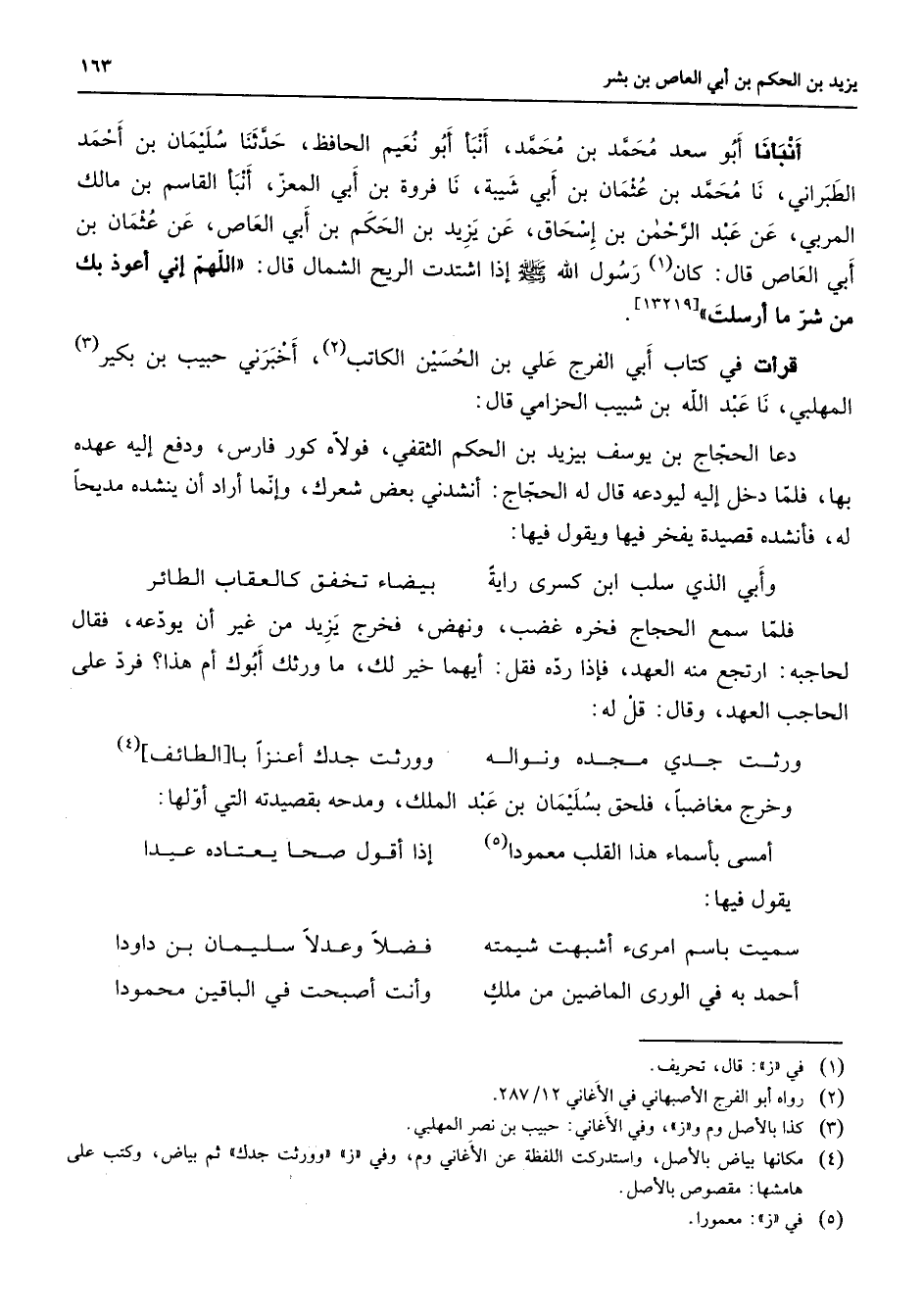 أنبأنا أبو سعد محمد بن محمد أنبأ أبو نعيم الحافظ حدثنا سليمان بن أحمد الطبراني نا محمد بن عثمان بن أبي شيبة نا فروة بن أبي المعز أنبأ القاسم بن مالك المربي عن عبد الرحمن بن إسحاق عن يزيد بن الحكم بن أبي العاص عن عثمان بن أبي العاص قال كان (1) رسول الله (صلى الله عليه وسلم) إذا اشتدت الريح الشمال قال اللهم إني أعوذ بك من شر ما أرسلت قرأت في كتاب أبي الفرج علي بن الحسين الكاتب (2) أخبرني حبيب بن بكير (3) المهلبي نا عبد الله بن شبيب الحزامي قال دعا الحجاج بن يوسف بيزيد بن الحكم الثقفي فولاه كور فارس ودفع إليه عهده بها فلما دخل إليه ليودعه قال له الحجاج أنشدني بعض شعرك وإنما أراد أن ينشده مديحا له فأنشده قصيدة يفخر فيها ويقول فيها وأبي الذي سلب ابن كسرى راية * بيضاء تخفق كالعقاب الطائر * فلما سمع الحجاج فخره غضب ونهض فخرج يزيد من غير أن يودعه فقال لحاجبه ارتجع منه العهد فإذا رده فقل أيهما خير لك ما ورثك أبوك أم هذا فرد على الحاجب العهد وقال قل له ورثت جدي مجده ونواله * وورثت جدك أعنزا بالطائف (4) وخرج مغاضبا فلحق بسليمان بن عبد الملك ومدحه بقصيدته التي أولها أمسى بأسماء هذا القلب معمودا (5) إذا أقول صحا يعتاده عيدا * يقول فيها سميت باسم امرئ أشبهت شيمته * فضلا وعدلا سليمان بن داودا أحمد به في الورى الماضين من ملك * وأنت أصبحت في الباقين محمودا