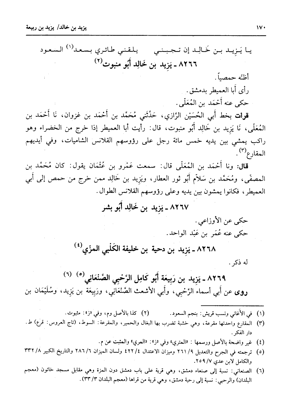 8266 - يزيد بن خالد أبو منبوت (2) أظنه حمصيا رأى أبا العميطر بدمشق حكى عنه أحمد بن المعلى قرأت بخط أبي الحسين الرازي حدثني محمد بن أحمد بن غزوان نا أحمد بن المعلى نا يزيد بن خالد أبو منبوت قال رأيت أبا العميطر إذا خرج من الخضراء وهو راكب يمشي بين يديه خمس مائة رجل على رؤوسهم القلانس الشاميات وفي أيديهم المقارع (3) قال ونا أحمد بن المعلى قال سمعت عمرو بن عثمان يقول كان محمد بن المصفى ومحمد بن سلام أبو ثور العطار ويزيد بن خالد ممن خرج من حمص إلى أبي العميطر فكانوا يمشون بين يديه وعلى رؤوسهم القلانس الطوال