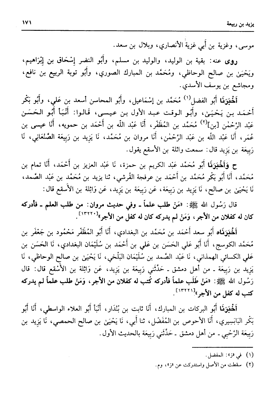 موسى وغزية بن أبي غزية الأنصاري وبلال بن سعد روى عنه بقية بن الوليد والوليد بن مسلم وأبو النضر إسحاق بن إبراهيم ويحيى بن صالح الوحاظي ومحمد بن المبارك الصوري وأبو توبة الربيع بن نافع ومجاشع بن يوسف الأسدي أخبرنا أبو الفضل (1) محمد بن إسماعيل وأبو المحاسن أسعد بن علي وأبو بكر أحمد بن يحيى وأبو الوقت عبد الأول بن عيسى قالوا أنبأ أبو الحسن عبد الرحمن بن (2) محمد بن المظفر أنا عبد الله بن أحمد بن حمويه أنا عيسى بن عمر أنا عبد الله بن عبد الرحمن أنا مروان بن محمد نا يزيد بن ربيعة الصنعاني نا ربيعة بن يزيد قال سمعت واثلة بن الأسقع يقول ح وأخبرنا أبو محمد عبد الكريم بن حمزة نا عبد العزيز بن أحمد أنا تمام بن محمد أنا أبو بكر محمد بن أحمد بن عرفجة القرشي ثنا يزيد بن محمد بن عبد الصمد نا يحيى بن صالح نا يزيد بن ربيعة عن ربيعة بن يزيد عن واثلة بن الأسقع قال قال رسول الله (صلى الله عليه وسلم) من طلب علما وفي حديث مروان من طلب العلم فأدركه كان له كفلان من الأجر ومن لم يدركه كان له كفل من الأجر أخبرناه أبو سعد أحمد بن محمد بن البغدادي أنا أبو المظفر محمود بن جعفر بن محمد الكوسج أنا أبو علي الحسن بن علي بن أحمد بن سليمان البغدادي نا الحسن بن علي الكسائي الهمذاني نا عبد الصمد بن سليمان البلخي نا يحيى بن صالح الوحاظي نا يزيد بن ربيعة من أهل دمشق حدثني ربيعة بن يزيد عن واثلة بن الأسقع قال قال رسول الله (صلى الله عليه وسلم) من طلب علما فأدركه كتب له كفلان من الأجر ومن طلب علما لم يدركه كتب له كفل من الأجر أخبرنا أبو البركات بن المبارك أنا ثابت بن بندار أنبأ أبو العلاء الواسطي أنا أبو بكر البابسيري أنا الأحوص بن المفضل ثنا أبي نا يحيى بن صالح الحمصي نا يزيد بن ربيعة الرحبي من أهل دمشق حدثني ربيعة بالحديث الأول