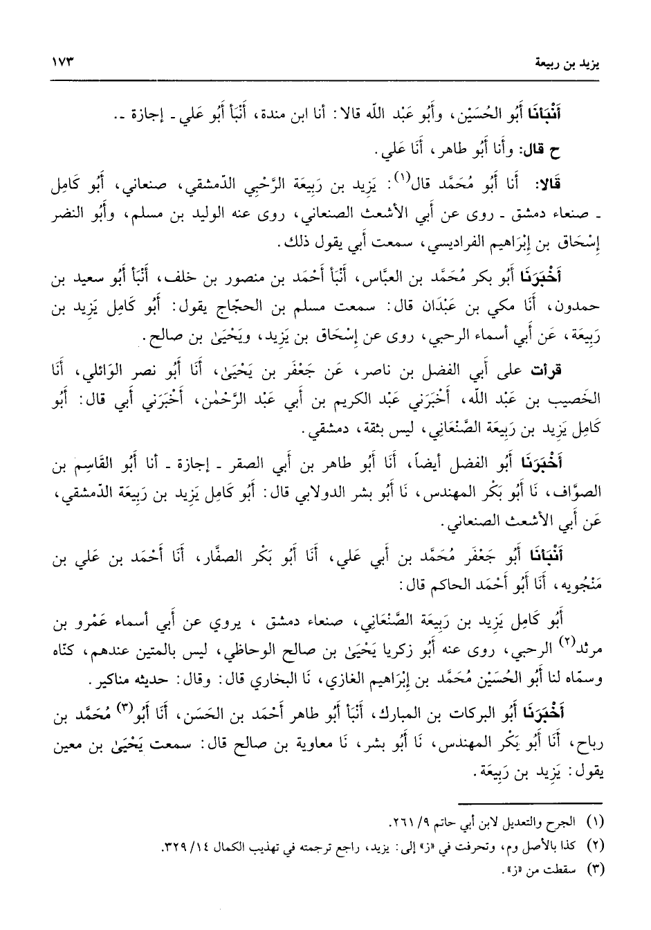 أنبأنا أبو الحسين وأبو عبد الله قالا أنا ابن مندة أنبأ أبو علي إجازة ح قال وأنا أبو طاهر أنا علي قالا أنا أبو محمد قال (1) يزيد بن ربيعة الرحبي الدمشقي صنعاني أبو كامل صنعاء دمشق روى عن أبي الأشعث الصنعاني روى عنه الوليد بن مسلم وأبو النضر إسحاق بن إبراهيم الفراديسي سمعت أبي يقول ذلك أخبرنا أبو بكر محمد بن العباس أنبأ أحمد بن منصور بن خلف أنبأ أبو سعيد بن حمدون أنا مكي بن عبدان قال سمعت مسلم بن الحجاج يقول أبو كامل يزيد بن ربيعة عن أبي أسماء الرحبي روى عن إسحاق بن يزيد ويحيى بن صالح قرأت على أبي الفضل بن ناصر عن جعفر بن يحيى أنا أبو نصر الوائلي أنا الخصيب بن عبد الله أخبرني عبد الكريم بن أبي عبد الرحمن أخبرني أبي قال أبو كامل يزيد بن ربيعة الصنعاني ليس بثقة دمشقي أخبرنا أبو الفضل أيضا أنا أبو طاهر بن أبي الصقر إجازة أنا أبو القاسم بن الصواف نا أبو بكر المهندس نا أبو بشر الدولابي قال أبو كامل يزيد بن ربيعة الدمشقي عن أبي الأشعث الصنعاني أنبأنا أبو جعفر محمد بن أبي علي أنا أبو بكر الصفار أنا أحمد بن علي بن منجويه أنا أبو أحمد الحاكم قال أبو كامل يزيد بن ربيعة الصنعاني صنعاء دمشق يروي عن أبي أسماء عمرو بن مرثد (2) الرحبي روى عنه أبو زكريا يحيى بن صالح الوحاظي ليس بالمتين عندهم كناه وسماه لنا أبو الحسين محمد بن إبراهيم الغازي نا البخاري قال وقال حديثه مناكير أخبرنا أبو البركات بن المبارك أنبأ أبو طاهر أحمد بن الحسن أنا أبو (3) محمد بن رباح أنا أبو بكر المهندس نا أبو بشر نا معاوية بن صالح قال سمعت يحيى بن معين يقول يزيد بن ربيعة