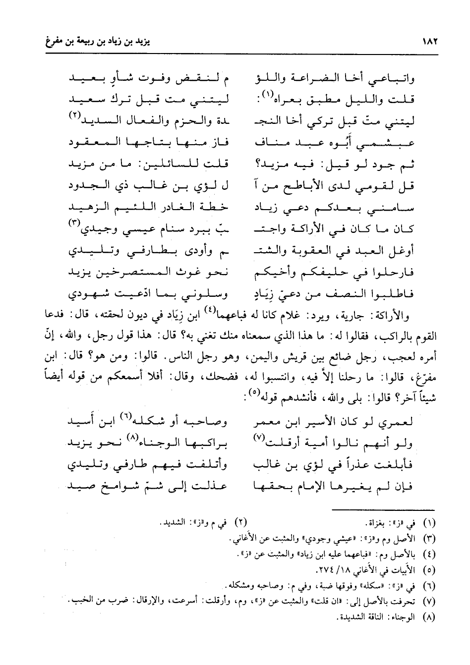 واتباعي أخا الضراعة واللؤ * م لنقض وفوت شأو بعيد قلت والليل مطبق بعراه (1) * ليتني مت قبل ترك سعيد ليتني مت قبل تركي أخا النج * دة والحزم والفعال السديد (2) عبشمي أبوه عبد مناف * فاز منها بتاجها المعقود ثم جود لو قيل فيه مزيد * قلت للسائلين ما من مزيد قل لقومي لدى الأباطح من آ * ل لؤي بن غالب ذي الجدود سامني بعدكم دعي زياد * خطة الغادر اللئيم الزهيد كان ما كان في الأراكة واجت * ب ببرد سنام عيسي وجيدي (3) أوغل العبد في العقوبة والشت * م وأودى بطارفي وتليدي فارحلوا في حليفكم وأخيكم * نحو غوث المستصرخين يزيد فاطلبوا النصف من دعي زياد * وسلوني بما ادعيت شهودي * والأراكة جارية ويرد غلام كانا له فباعهما (4) ابن زياد في ديون لحقته قال فدعا القوم بالراكب فقالوا له ما هذا الذي سمعناه منك تغني به قال هذا قول رجل والله إن أمره لعجب رجل ضائع بين قريش واليمن وهو رجل الناس قالوا ومن هو قال ابن مفرغ قالوا ما رحلنا إلا فيه وانتسبوا له فضحك وقال أفلا أسمعكم من قوله أيضا شيئا آخر قالوا بلى والله فأنشدهم قوله (5) * لعمري لو كان الأسير ابن معمر * وصاحبه أو شكله (6) ابن أسيد ولو أنهم نالوا أمية أرقلت (7) * براكبها الوجناء (8) نحو يزيد فأبلغت عذرا في لؤي بن غالب * وأتلفت فيهم طارفي وتليدي فإن لم يغيرها الإمام بحقها * عذلت إلى شم شوامخ صيد