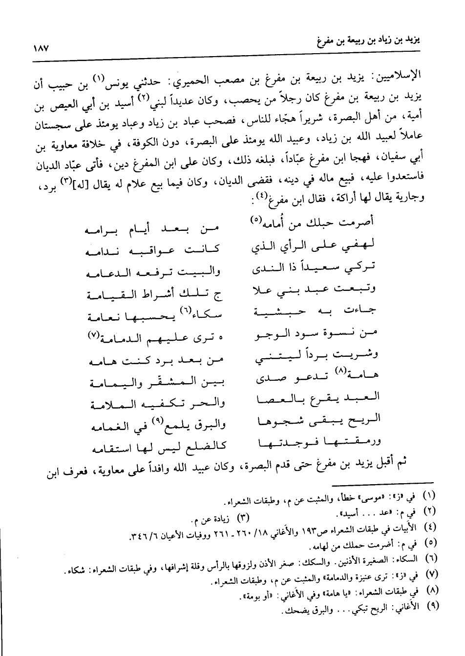 الإسلاميين يزيد بن ربيعة بن مفرغ بن مصعب الحميري حدثني يونس (1) بن حبيب أن يزيد بن ربيعة بن مفرغ كان رجلا من يحصب وكان عديدا لبني - 2) أسيد بن أبي العيص بن أمية من أهل البصرة شريرا هجاء للناس فصحب عباد بن زياد وعباد يومئذ على سجستان عاملا لعبيد الله بن زياد وعبيد الله يومئذ على البصرة دون الكوفة في خلافة معاوية بن أبي سفيان فهجا ابن مفرغ عبادا فبلغه ذلك وكان على ابن المفرغ دين فأتى عباد الديان فاستعدوا عليه فبيع ماله في دينه فقضى الديان وكان فيما بيع غلام له (3) يقال له برد وجارية يقال لها أراكة فقال ابن مفرغ (4) * أصرمت حبلك من أمامه (5) * من بعد أيام برامه لهفي على الرأي الذي * كانت عواقبه ندامه تركي سعيدا ذا الندى * والبيت ترفعه الدعامه وتبعت عبد بني علا * ج تلك أشراط القيامة جاءت به حبشية * سكاء (6) يحسبها نعامة من نسوة سود الوجو * هـ ترى عليهم الدمامة (7) وشريت بردا ليتني * من بعد برد كنت هامه هامة (8) تدعو صدى * بين المشقر واليمامة العبد يقرع بالعصا * والحر تكفيه الملامة الريح يبقى شجوها * والبرق يلمع (9) في الغمامه ورمقتها فوجدتها * كالضلع ليس لها استقامه * ثم أقبل يزيد بن مفرغ حتى قدم البصرة وكان عبيد الله وافدا على معاوية فعرف ابن