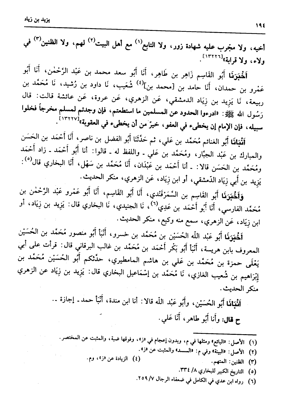 أخيه ولا مجرب عليه شهادة زور ولا التابع (1) مع أهل البيت (2) لهم ولا الظنين (3) في ولاء ولا قرابة أخبرنا أبو القاسم زاهر بن طاهر أنا أبو سعد محمد بن عبد الرحمن أنا أبو عمرو بن حمدان أنا حامد بن محمد بن (4) شعيب نا داود بن رشيد نا محمد بن ربيعة نا يزيد بن زياد الدمشقي عن الزهري عن عروة عن عائشة قالت قال رسول الله (صلى الله عليه وسلم) ادرعوا الحدود عن المسلمين ما استطعتم فإن وجدتم لمسلم مخرجا فخلوا سبيله فإن الإمام إن يخطئ في العفو خير من أن يخطئ في العقوبة أنبأنا أبو الغنائم محمد بن علي ثم حدثنا أبو الفضل بن ناصر أنا أحمد بن الحسن والمبارك بن عبد الجبار ومحمد بن علي واللفظ له قالوا أنا أبو أحمد زاد أحمد ومحمد بن الحسن قالا أنا أحمد بن عبدان أنا محمد بن سهل أنا البخاري قال (5) يزيد بن أبي زياد الدمشقي أو ابن زياد عن الزهري منكر الحديث أخبرنا أبو القاسم بن السمرقندي أنا أبو القاسم أنا أبو عمرو عبد الرحمن بن محمد الفارسي أنا أبو احمد بن عدي (6) نا الجنيدي نا البخاري قال يزيد بن زياد أو ابن زياد عن الزهري سمع منه وكيع منكر الحديث أخبرنا أبو عبد الله الحسين بن محمد بن خسرو أنبأ أبو منصور محمد بن الحسين المعروف بابن هريسة أنبأ أبو بكر أحمد بن محمد بن غالب البرقاني قال قرأت على أبي يعلى حمزة بن محمد بن علي بن هاشم المامطيري حدثكم أبو الحسين محمد بن إبراهيم بن شعيب الغازي نا محمد بن إسماعيل البخاري قال يزيد بن زياد عن الزهري منكر الحديث أنبأنا أبو الحسين وأبو عبد الله قالا أنا ابن مندة أنا حمد إجازة ح قال وأنا أبو طاهر أنا علي